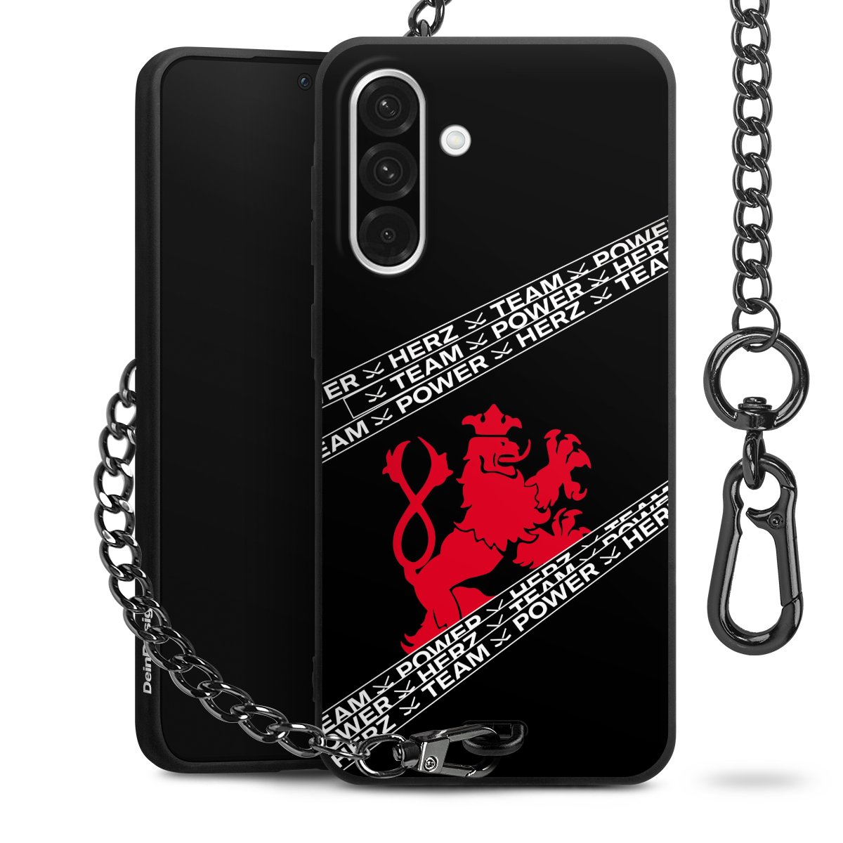 Die mattschwarze Silikon-Handyhülle besteht aus robustem TPU (thermoplastisches Polyurethan). Sie ist flexibel und schützt Dein Smartphone vor Stößen und Kratzern. Die Kette sowie der Karabinerhaken sind aus Metall in Gunmetal-Optik gefertigt. Für dieses Produkt kommen ausschließlich TÜV-geprüfte Materialien zum Einsatz.
