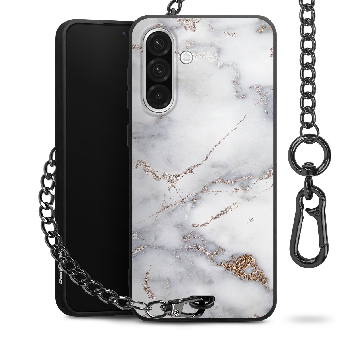 Die mattschwarze Silikon-Handyhülle besteht aus robustem TPU (thermoplastisches Polyurethan). Sie ist flexibel und schützt Dein Smartphone vor Stößen und Kratzern. Die Kette sowie der Karabinerhaken sind aus Metall in Gunmetal-Optik gefertigt. Für dieses Produkt kommen ausschließlich TÜV-geprüfte Materialien zum Einsatz.