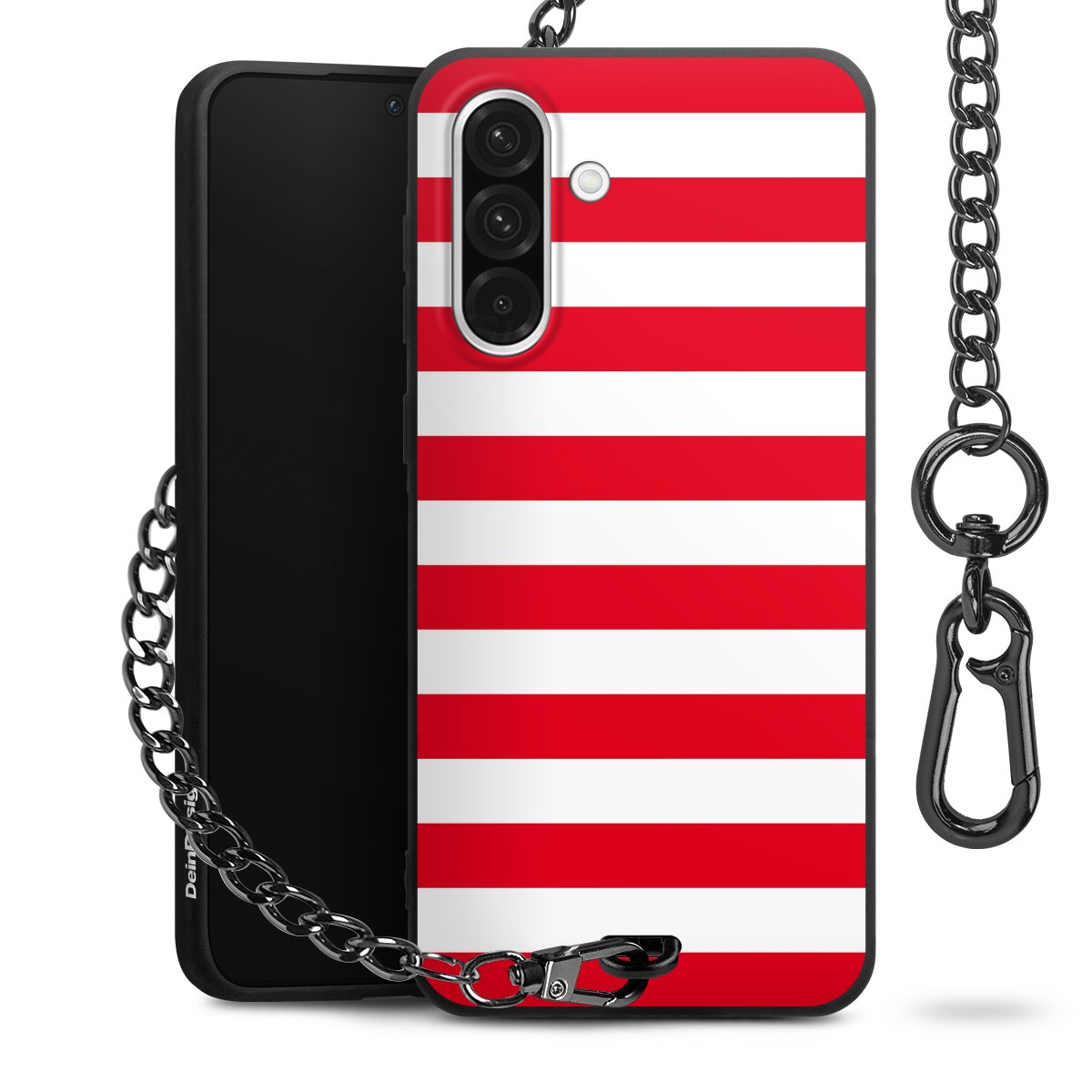 Die mattschwarze Silikon-Handyhülle besteht aus robustem TPU (thermoplastisches Polyurethan). Sie ist flexibel und schützt Dein Smartphone vor Stößen und Kratzern. Die Kette sowie der Karabinerhaken sind aus Metall in Gunmetal-Optik gefertigt. Für dieses Produkt kommen ausschließlich TÜV-geprüfte Materialien zum Einsatz.