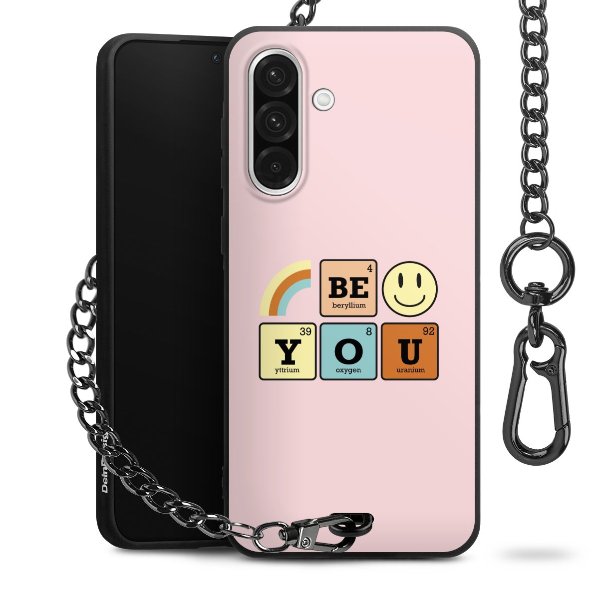 Die mattschwarze Silikon-Handyhülle besteht aus robustem TPU (thermoplastisches Polyurethan). Sie ist flexibel und schützt Dein Smartphone vor Stößen und Kratzern. Die Kette sowie der Karabinerhaken sind aus Metall in Gunmetal-Optik gefertigt. Für dieses Produkt kommen ausschließlich TÜV-geprüfte Materialien zum Einsatz.