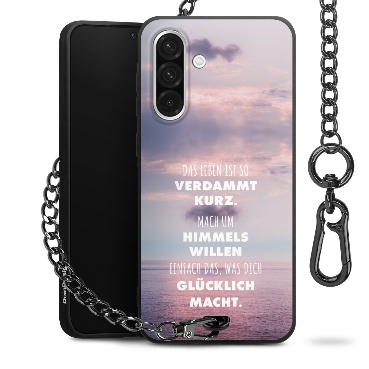 Die mattschwarze Silikon-Handyhülle besteht aus robustem TPU (thermoplastisches Polyurethan). Sie ist flexibel und schützt Dein Smartphone vor Stößen und Kratzern. Die Kette sowie der Karabinerhaken sind aus Metall in Gunmetal-Optik gefertigt. Für dieses Produkt kommen ausschließlich TÜV-geprüfte Materialien zum Einsatz.
