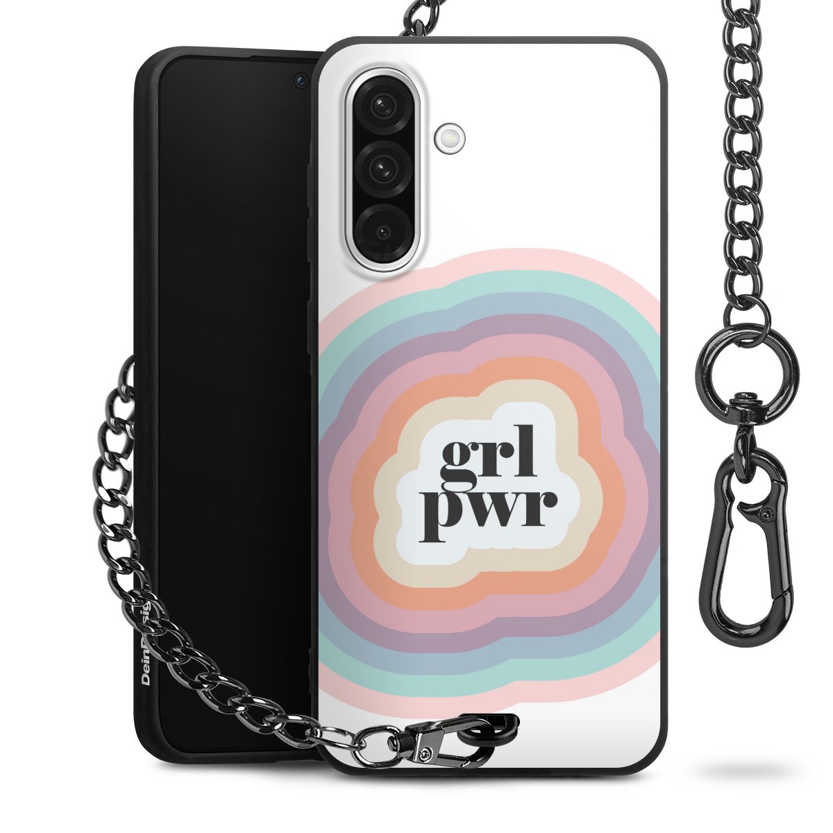 Die mattschwarze Silikon-Handyhülle besteht aus robustem TPU (thermoplastisches Polyurethan). Sie ist flexibel und schützt Dein Smartphone vor Stößen und Kratzern. Die Kette sowie der Karabinerhaken sind aus Metall in Gunmetal-Optik gefertigt. Für dieses Produkt kommen ausschließlich TÜV-geprüfte Materialien zum Einsatz.