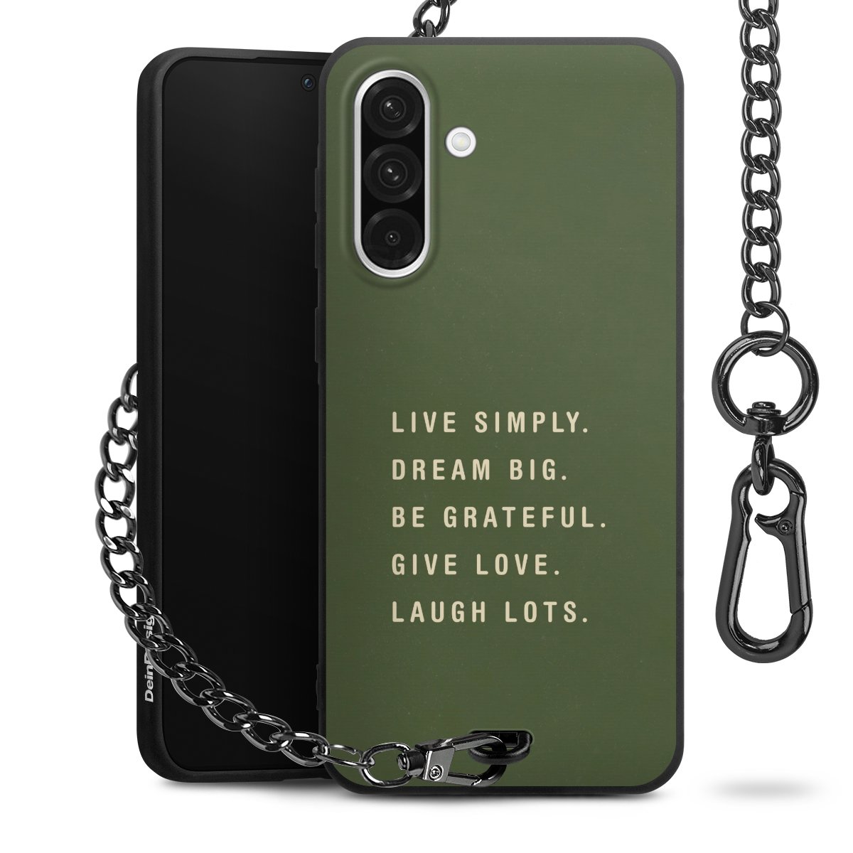 Die mattschwarze Silikon-Handyhülle besteht aus robustem TPU (thermoplastisches Polyurethan). Sie ist flexibel und schützt Dein Smartphone vor Stößen und Kratzern. Die Kette sowie der Karabinerhaken sind aus Metall in Gunmetal-Optik gefertigt. Für dieses Produkt kommen ausschließlich TÜV-geprüfte Materialien zum Einsatz.