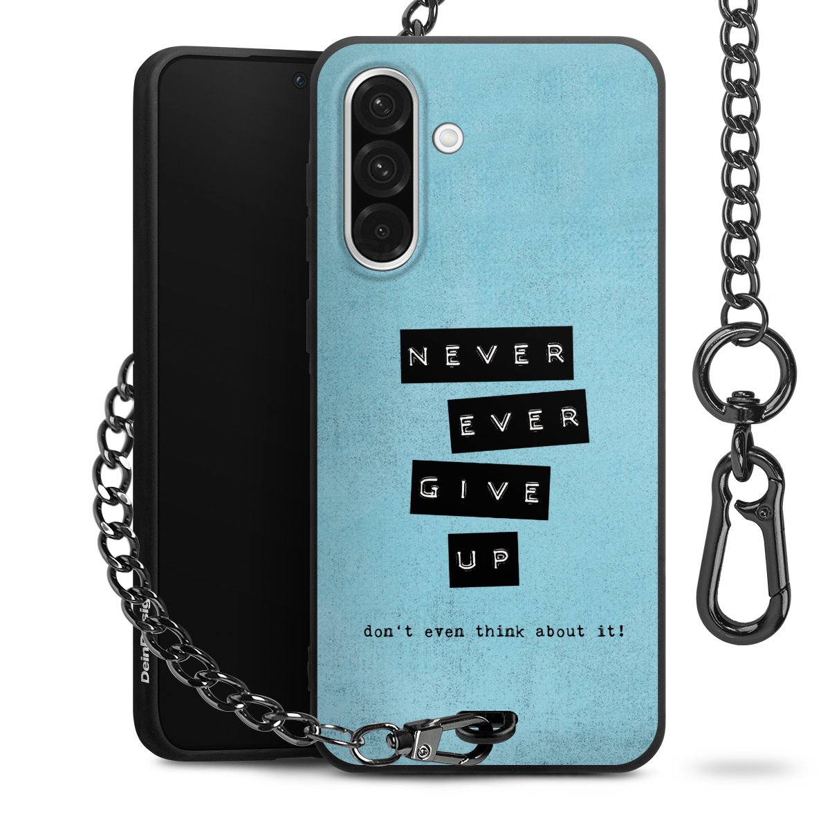Die mattschwarze Silikon-Handyhülle besteht aus robustem TPU (thermoplastisches Polyurethan). Sie ist flexibel und schützt Dein Smartphone vor Stößen und Kratzern. Die Kette sowie der Karabinerhaken sind aus Metall in Gunmetal-Optik gefertigt. Für dieses Produkt kommen ausschließlich TÜV-geprüfte Materialien zum Einsatz.