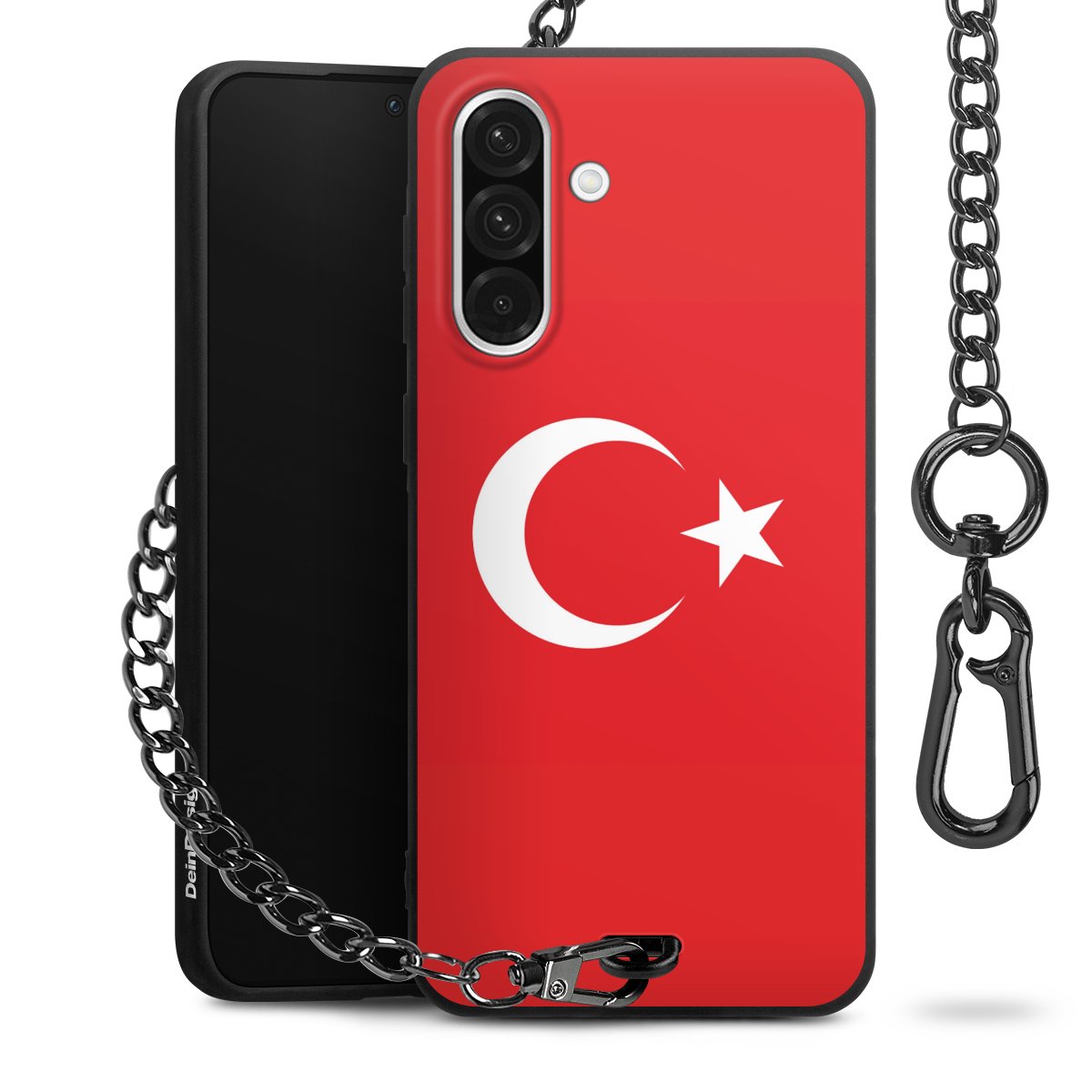Die mattschwarze Silikon-Handyhülle besteht aus robustem TPU (thermoplastisches Polyurethan). Sie ist flexibel und schützt Dein Smartphone vor Stößen und Kratzern. Die Kette sowie der Karabinerhaken sind aus Metall in Gunmetal-Optik gefertigt. Für dieses Produkt kommen ausschließlich TÜV-geprüfte Materialien zum Einsatz.