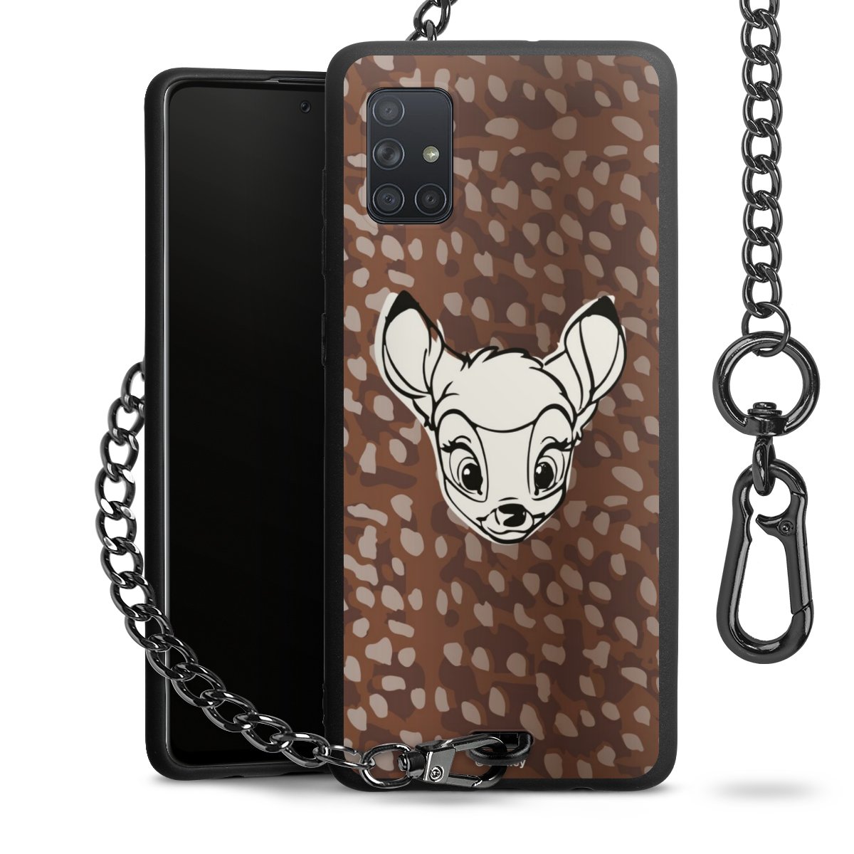 Die Handyhülle verfügt über eine mittig am unteren Rand platzierte Öse, an der die Metallkette stabil befestigt ist. Bestelle die Hülle einfach für Dein Smartphone-Modell, dann passt sie wie angegossen und Du brauchst sie bloß einmal anzudrücken. Handy in die Tasche, Karabiner an den Hosenbund – schon kann die Party starten.