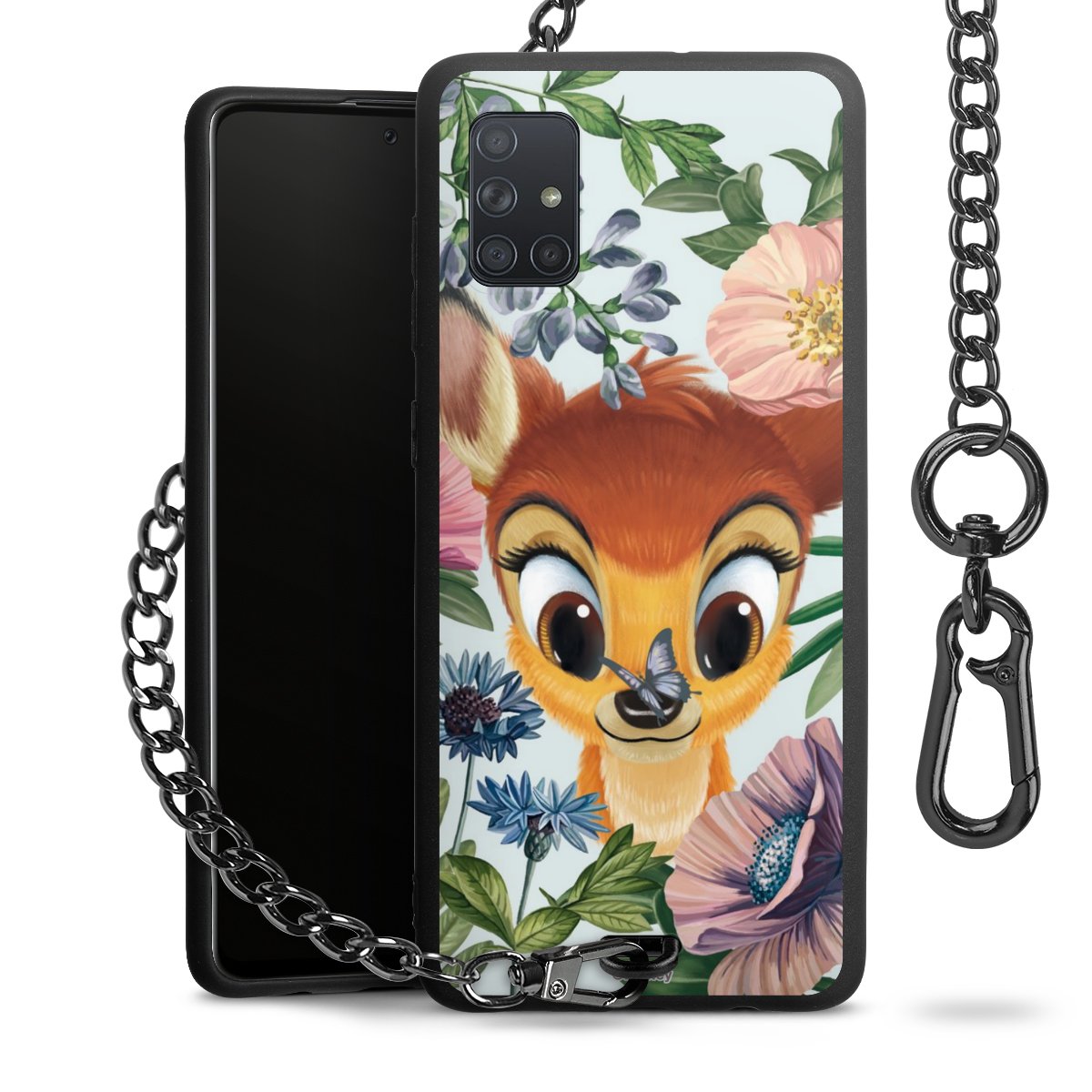 Die Handyhülle verfügt über eine mittig am unteren Rand platzierte Öse, an der die Metallkette stabil befestigt ist. Bestelle die Hülle einfach für Dein Smartphone-Modell, dann passt sie wie angegossen und Du brauchst sie bloß einmal anzudrücken. Handy in die Tasche, Karabiner an den Hosenbund – schon kann die Party starten.