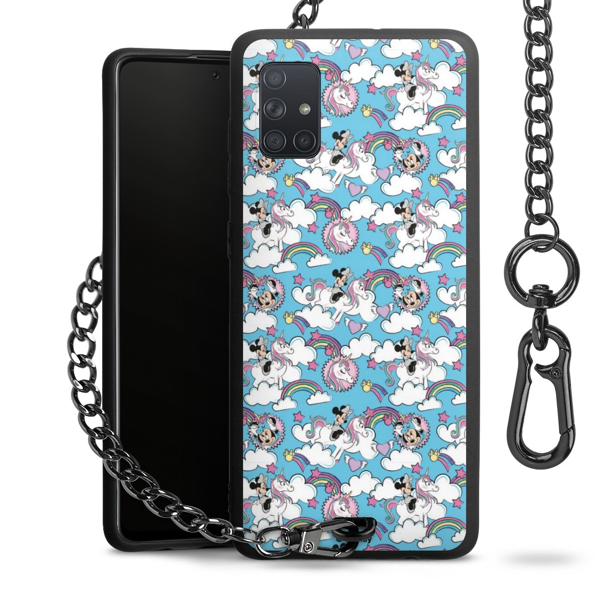 Die Handyhülle verfügt über eine mittig am unteren Rand platzierte Öse, an der die Metallkette stabil befestigt ist. Bestelle die Hülle einfach für Dein Smartphone-Modell, dann passt sie wie angegossen und Du brauchst sie bloß einmal anzudrücken. Handy in die Tasche, Karabiner an den Hosenbund – schon kann die Party starten.
