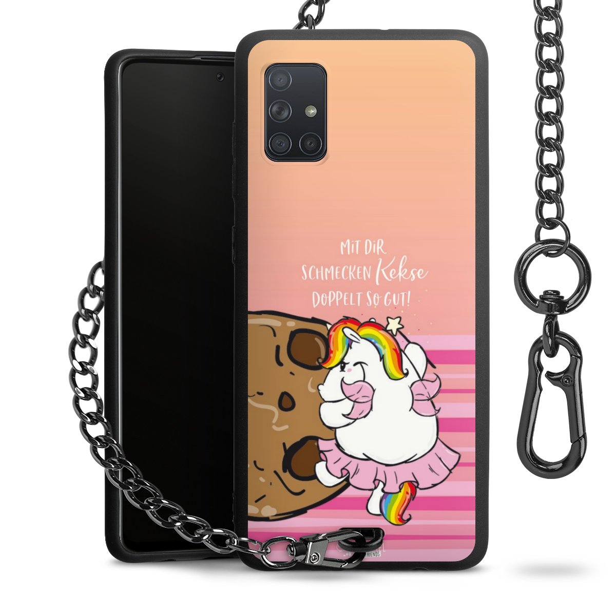 Die mattschwarze Silikon-Handyhülle besteht aus robustem TPU (thermoplastisches Polyurethan). Sie ist flexibel und schützt Dein Smartphone vor Stößen und Kratzern. Die Kette sowie der Karabinerhaken sind aus Metall in Gunmetal-Optik gefertigt. Für dieses Produkt kommen ausschließlich TÜV-geprüfte Materialien zum Einsatz.