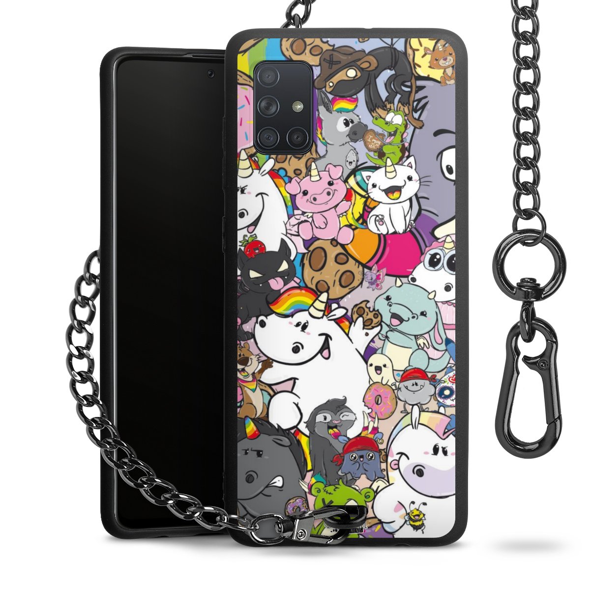 Die Handyhülle verfügt über eine mittig am unteren Rand platzierte Öse, an der die Metallkette stabil befestigt ist. Bestelle die Hülle einfach für Dein Smartphone-Modell, dann passt sie wie angegossen und Du brauchst sie bloß einmal anzudrücken. Handy in die Tasche, Karabiner an den Hosenbund – schon kann die Party starten.