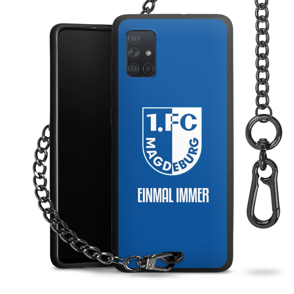 Die Handyhülle verfügt über eine mittig am unteren Rand platzierte Öse, an der die Metallkette stabil befestigt ist. Bestelle die Hülle einfach für Dein Smartphone-Modell, dann passt sie wie angegossen und Du brauchst sie bloß einmal anzudrücken. Handy in die Tasche, Karabiner an den Hosenbund – schon kann die Party starten.