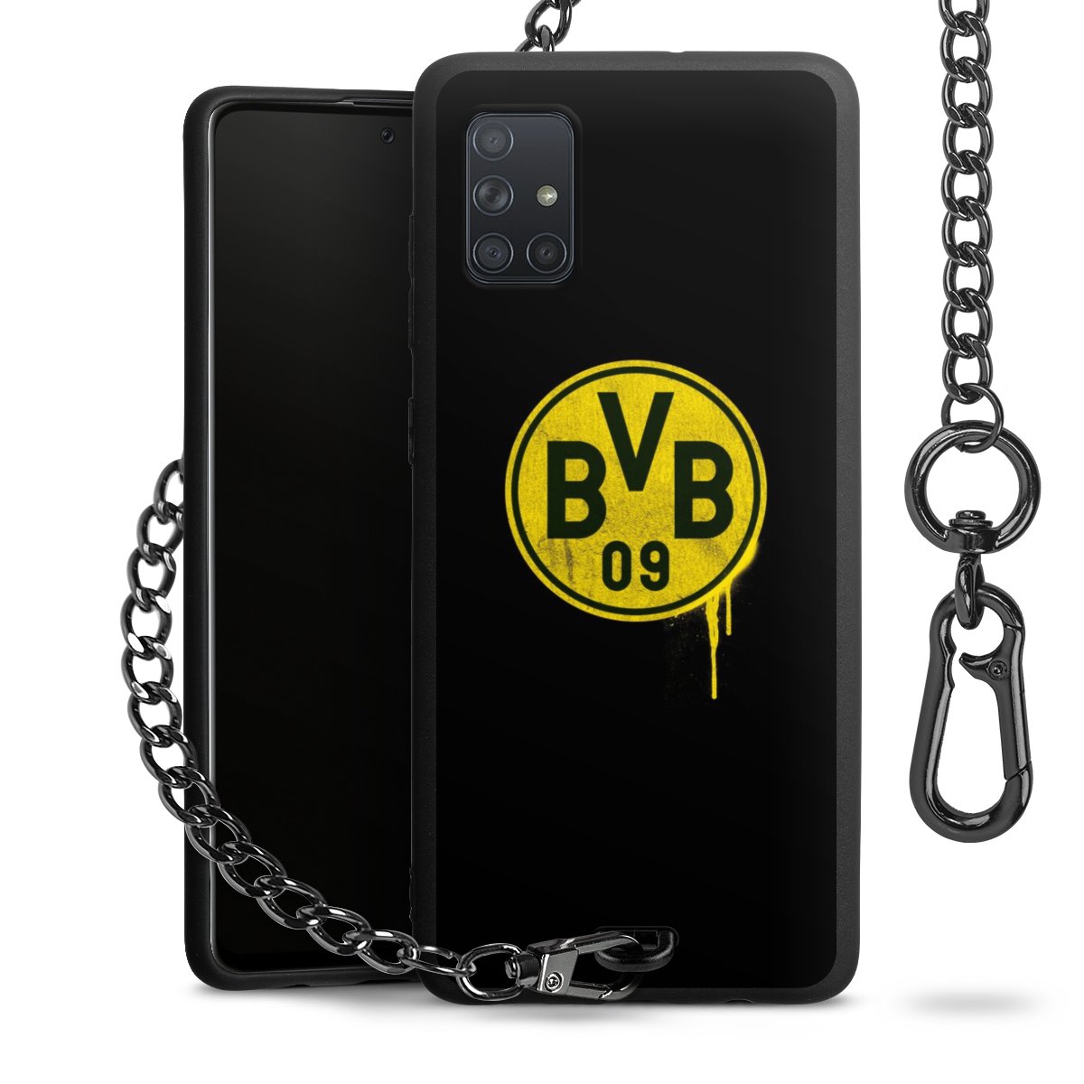 Die mattschwarze Silikon-Handyhülle besteht aus robustem TPU (thermoplastisches Polyurethan). Sie ist flexibel und schützt Dein Smartphone vor Stößen und Kratzern. Die Kette sowie der Karabinerhaken sind aus Metall in Gunmetal-Optik gefertigt. Für dieses Produkt kommen ausschließlich TÜV-geprüfte Materialien zum Einsatz.