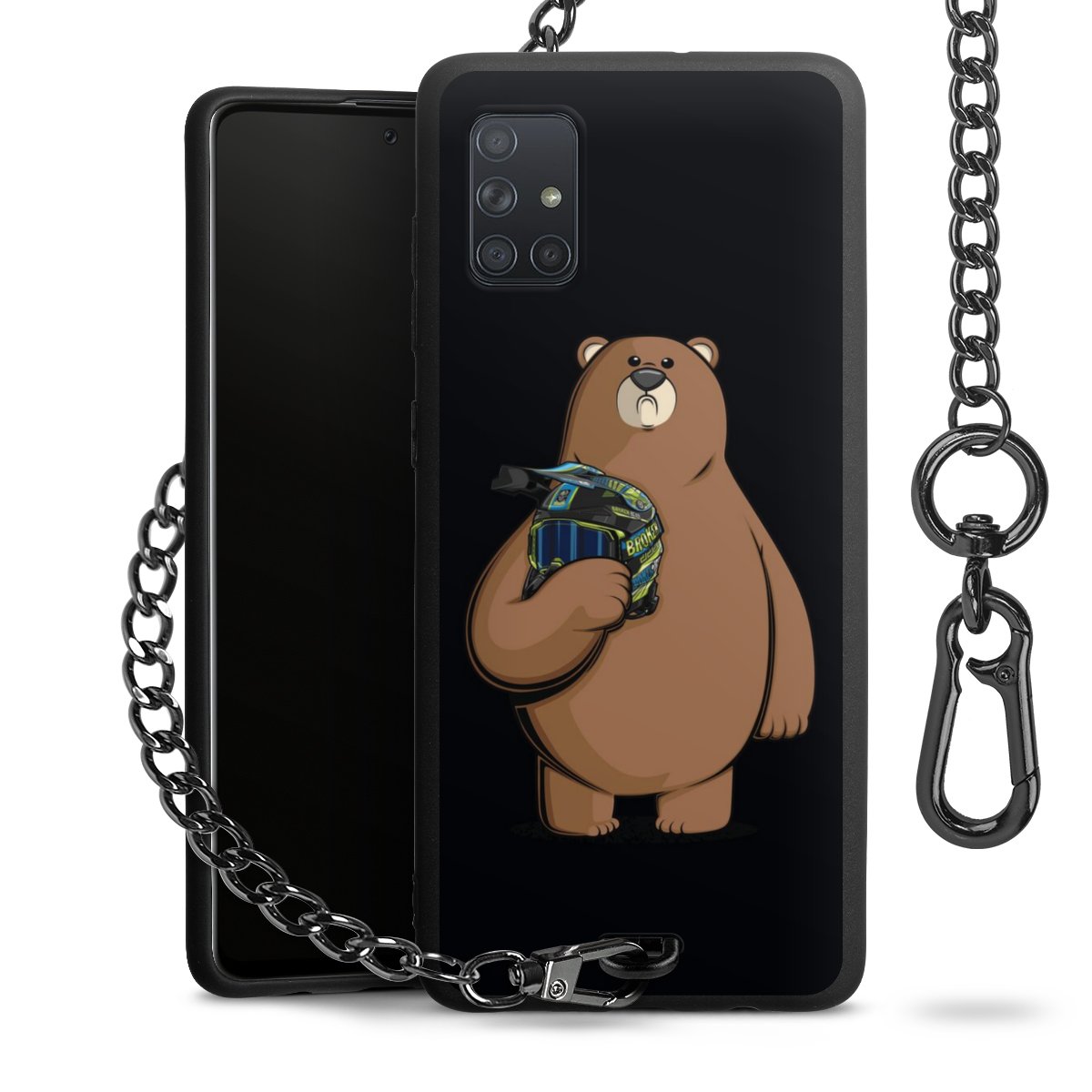 Die mattschwarze Silikon-Handyhülle besteht aus robustem TPU (thermoplastisches Polyurethan). Sie ist flexibel und schützt Dein Smartphone vor Stößen und Kratzern. Die Kette sowie der Karabinerhaken sind aus Metall in Gunmetal-Optik gefertigt. Für dieses Produkt kommen ausschließlich TÜV-geprüfte Materialien zum Einsatz.