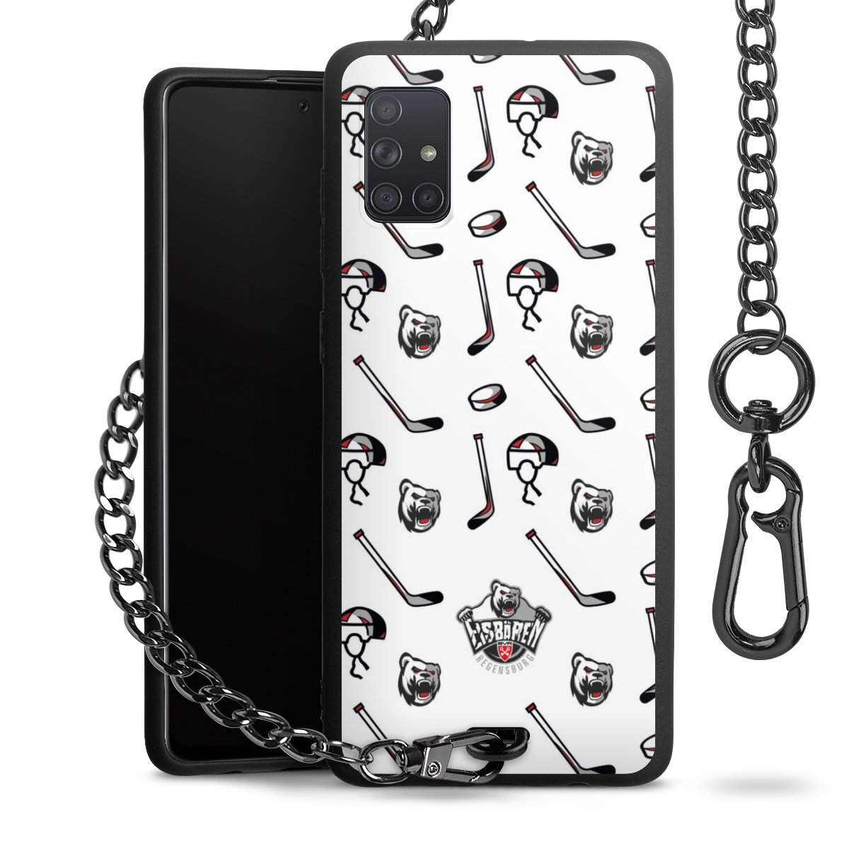 Die mattschwarze Silikon-Handyhülle besteht aus robustem TPU (thermoplastisches Polyurethan). Sie ist flexibel und schützt Dein Smartphone vor Stößen und Kratzern. Die Kette sowie der Karabinerhaken sind aus Metall in Gunmetal-Optik gefertigt. Für dieses Produkt kommen ausschließlich TÜV-geprüfte Materialien zum Einsatz.