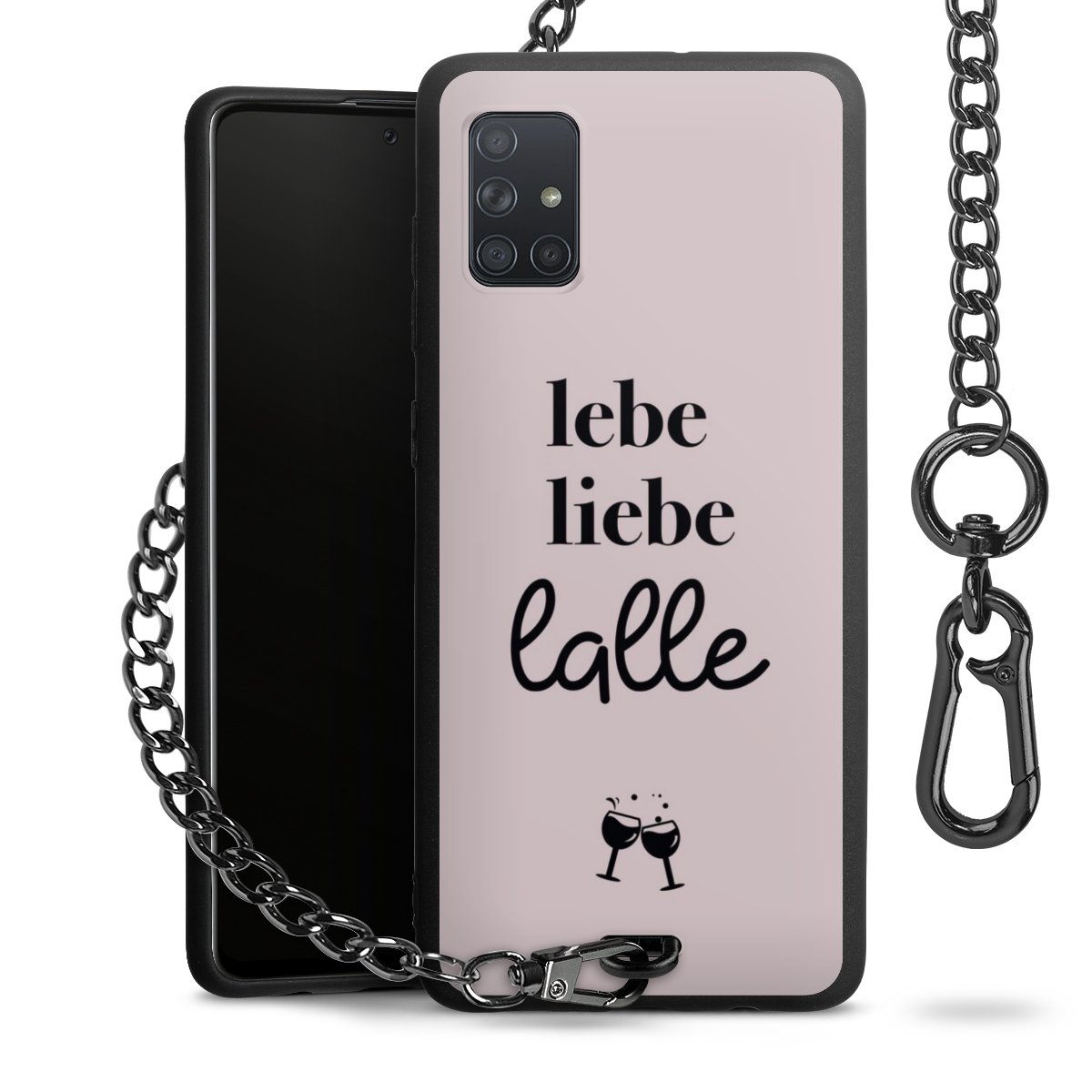 Die Handyhülle verfügt über eine mittig am unteren Rand platzierte Öse, an der die Metallkette stabil befestigt ist. Bestelle die Hülle einfach für Dein Smartphone-Modell, dann passt sie wie angegossen und Du brauchst sie bloß einmal anzudrücken. Handy in die Tasche, Karabiner an den Hosenbund – schon kann die Party starten.