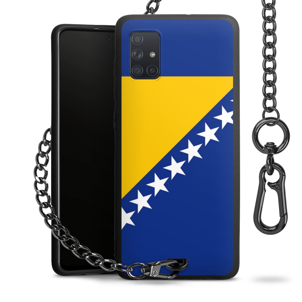 Die mattschwarze Silikon-Handyhülle besteht aus robustem TPU (thermoplastisches Polyurethan). Sie ist flexibel und schützt Dein Smartphone vor Stößen und Kratzern. Die Kette sowie der Karabinerhaken sind aus Metall in Gunmetal-Optik gefertigt. Für dieses Produkt kommen ausschließlich TÜV-geprüfte Materialien zum Einsatz.