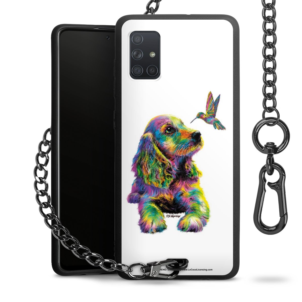 Die Handyhülle verfügt über eine mittig am unteren Rand platzierte Öse, an der die Metallkette stabil befestigt ist. Bestelle die Hülle einfach für Dein Smartphone-Modell, dann passt sie wie angegossen und Du brauchst sie bloß einmal anzudrücken. Handy in die Tasche, Karabiner an den Hosenbund – schon kann die Party starten.
