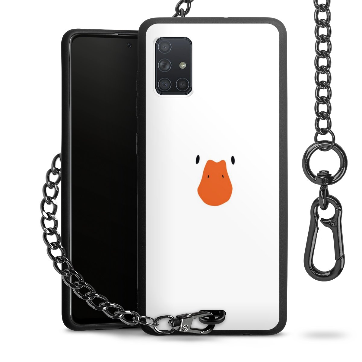 Die Handyhülle verfügt über eine mittig am unteren Rand platzierte Öse, an der die Metallkette stabil befestigt ist. Bestelle die Hülle einfach für Dein Smartphone-Modell, dann passt sie wie angegossen und Du brauchst sie bloß einmal anzudrücken. Handy in die Tasche, Karabiner an den Hosenbund – schon kann die Party starten.