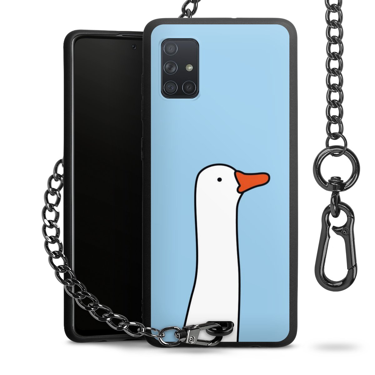 Die Handyhülle verfügt über eine mittig am unteren Rand platzierte Öse, an der die Metallkette stabil befestigt ist. Bestelle die Hülle einfach für Dein Smartphone-Modell, dann passt sie wie angegossen und Du brauchst sie bloß einmal anzudrücken. Handy in die Tasche, Karabiner an den Hosenbund – schon kann die Party starten.