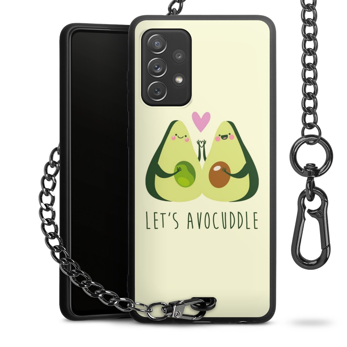 Die Handyhülle verfügt über eine mittig am unteren Rand platzierte Öse, an der die Metallkette stabil befestigt ist. Bestelle die Hülle einfach für Dein Smartphone-Modell, dann passt sie wie angegossen und Du brauchst sie bloß einmal anzudrücken. Handy in die Tasche, Karabiner an den Hosenbund – schon kann die Party starten.