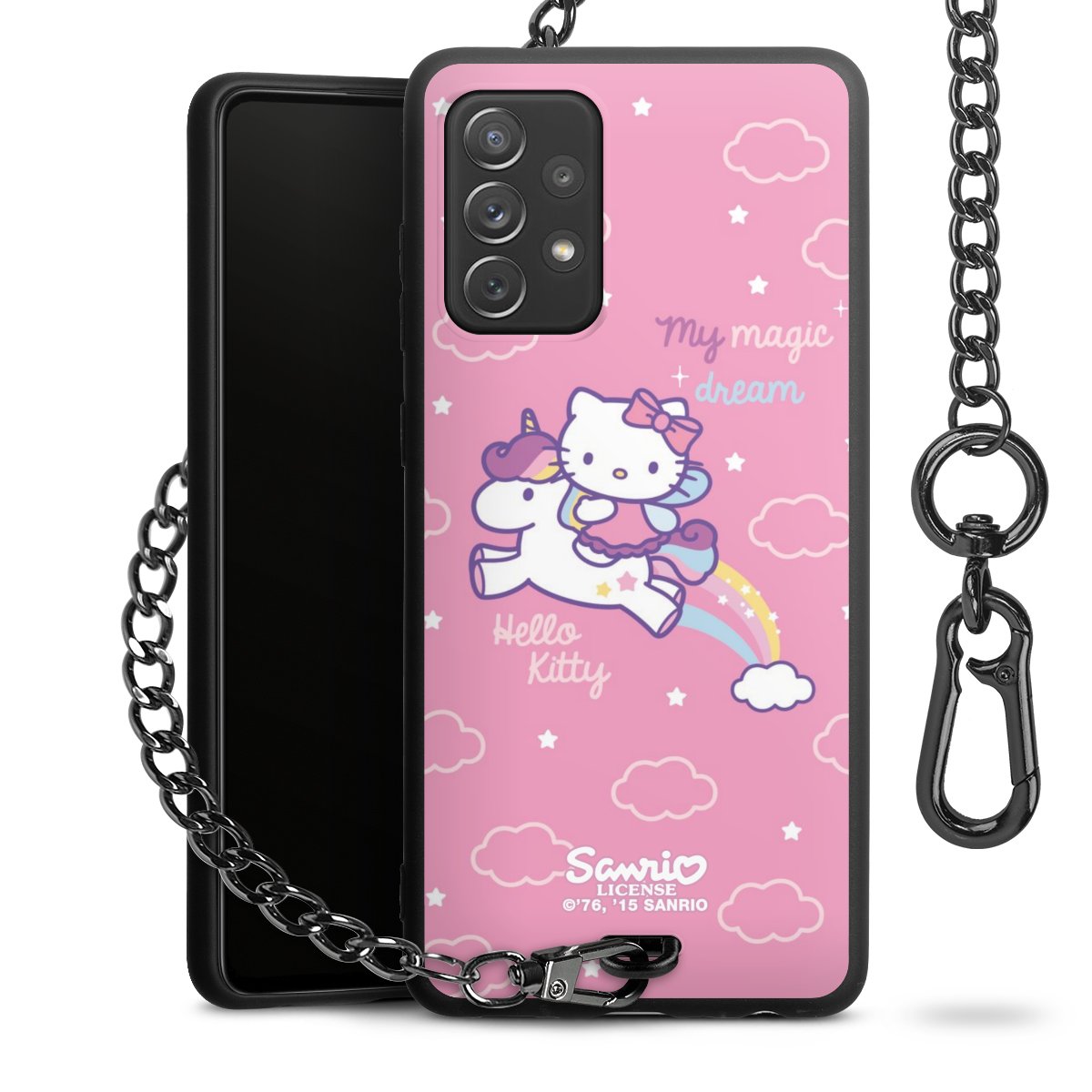 Die Handyhülle verfügt über eine mittig am unteren Rand platzierte Öse, an der die Metallkette stabil befestigt ist. Bestelle die Hülle einfach für Dein Smartphone-Modell, dann passt sie wie angegossen und Du brauchst sie bloß einmal anzudrücken. Handy in die Tasche, Karabiner an den Hosenbund – schon kann die Party starten.