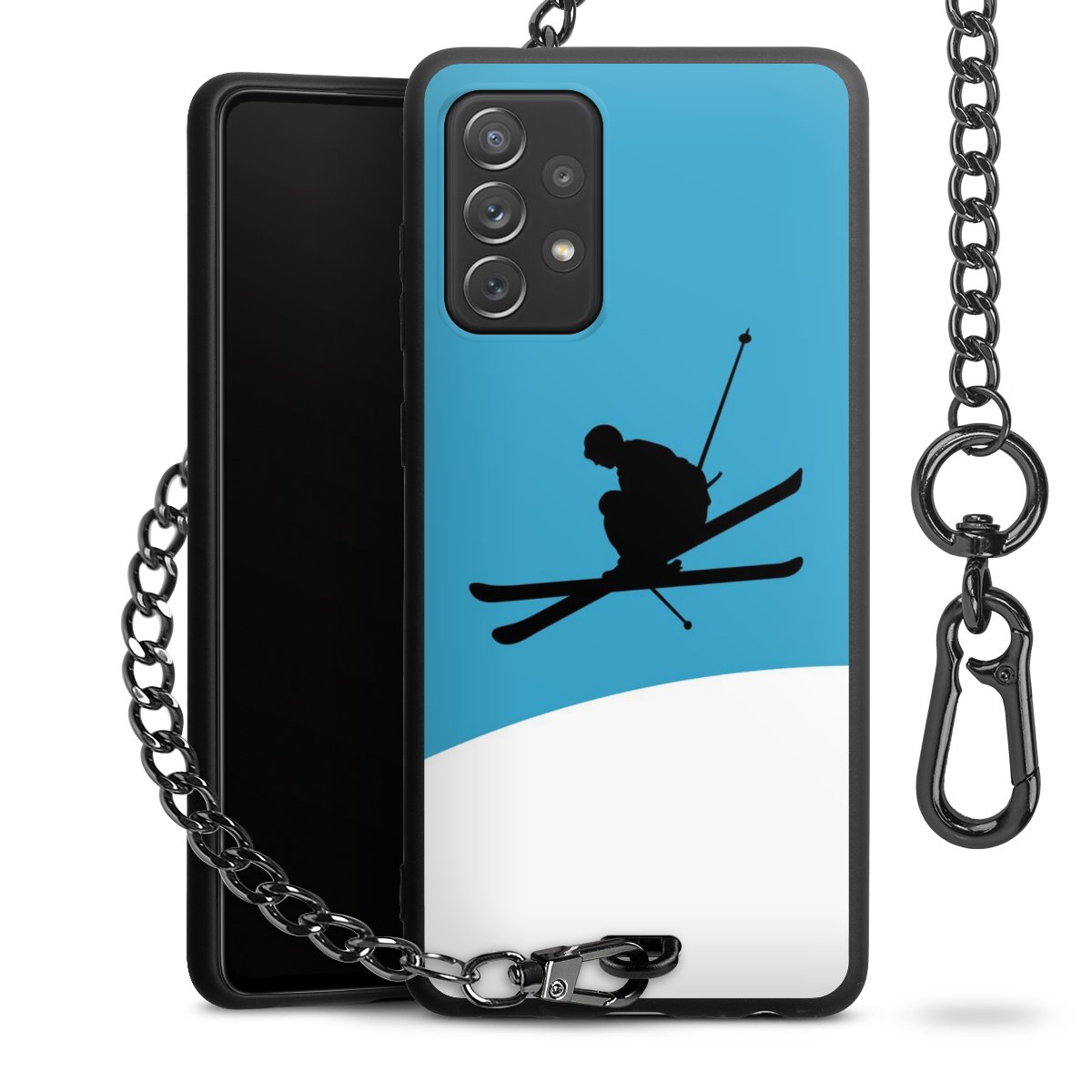 Die Handyhülle verfügt über eine mittig am unteren Rand platzierte Öse, an der die Metallkette stabil befestigt ist. Bestelle die Hülle einfach für Dein Smartphone-Modell, dann passt sie wie angegossen und Du brauchst sie bloß einmal anzudrücken. Handy in die Tasche, Karabiner an den Hosenbund – schon kann die Party starten.