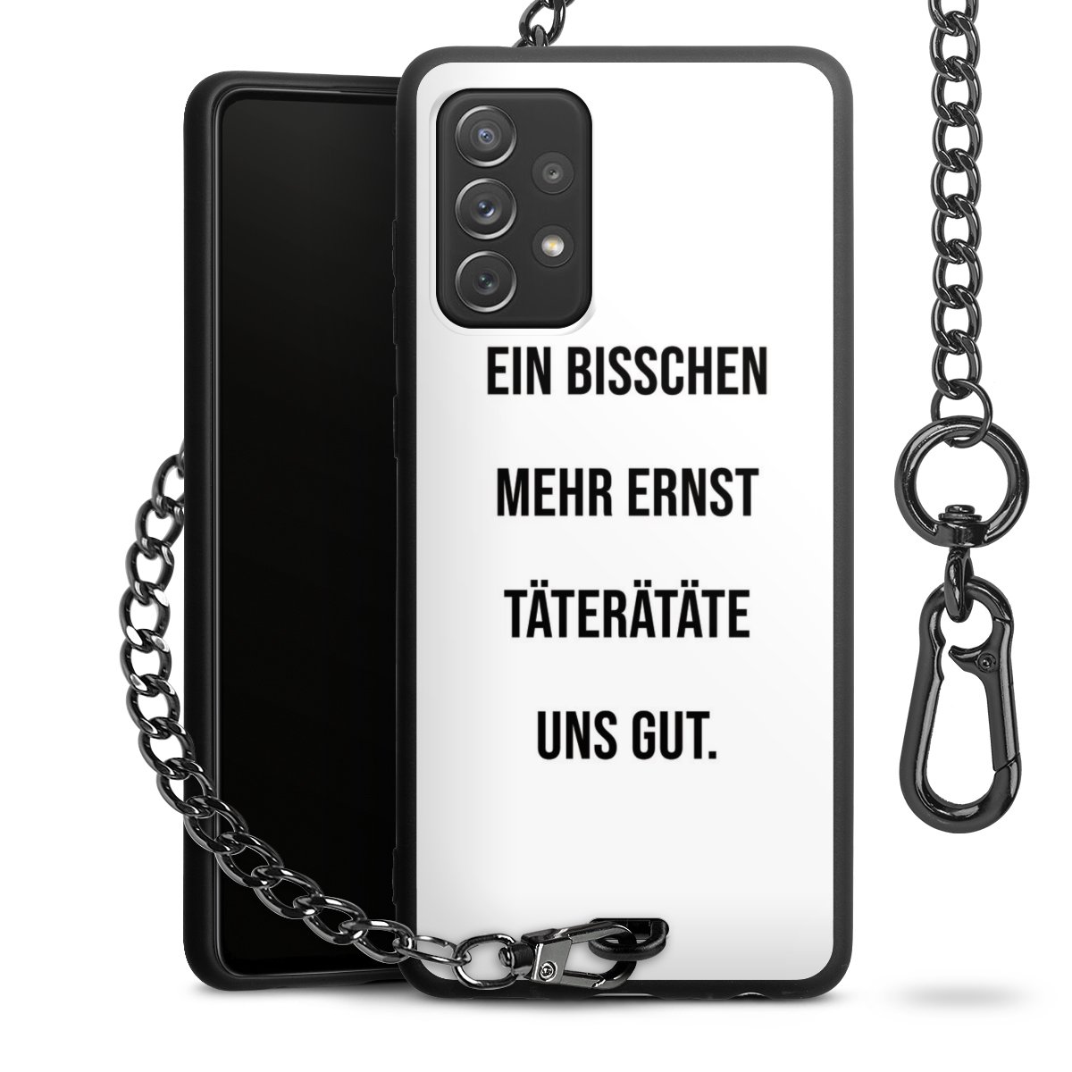 Die mattschwarze Silikon-Handyhülle besteht aus robustem TPU (thermoplastisches Polyurethan). Sie ist flexibel und schützt Dein Smartphone vor Stößen und Kratzern. Die Kette sowie der Karabinerhaken sind aus Metall in Gunmetal-Optik gefertigt. Für dieses Produkt kommen ausschließlich TÜV-geprüfte Materialien zum Einsatz.