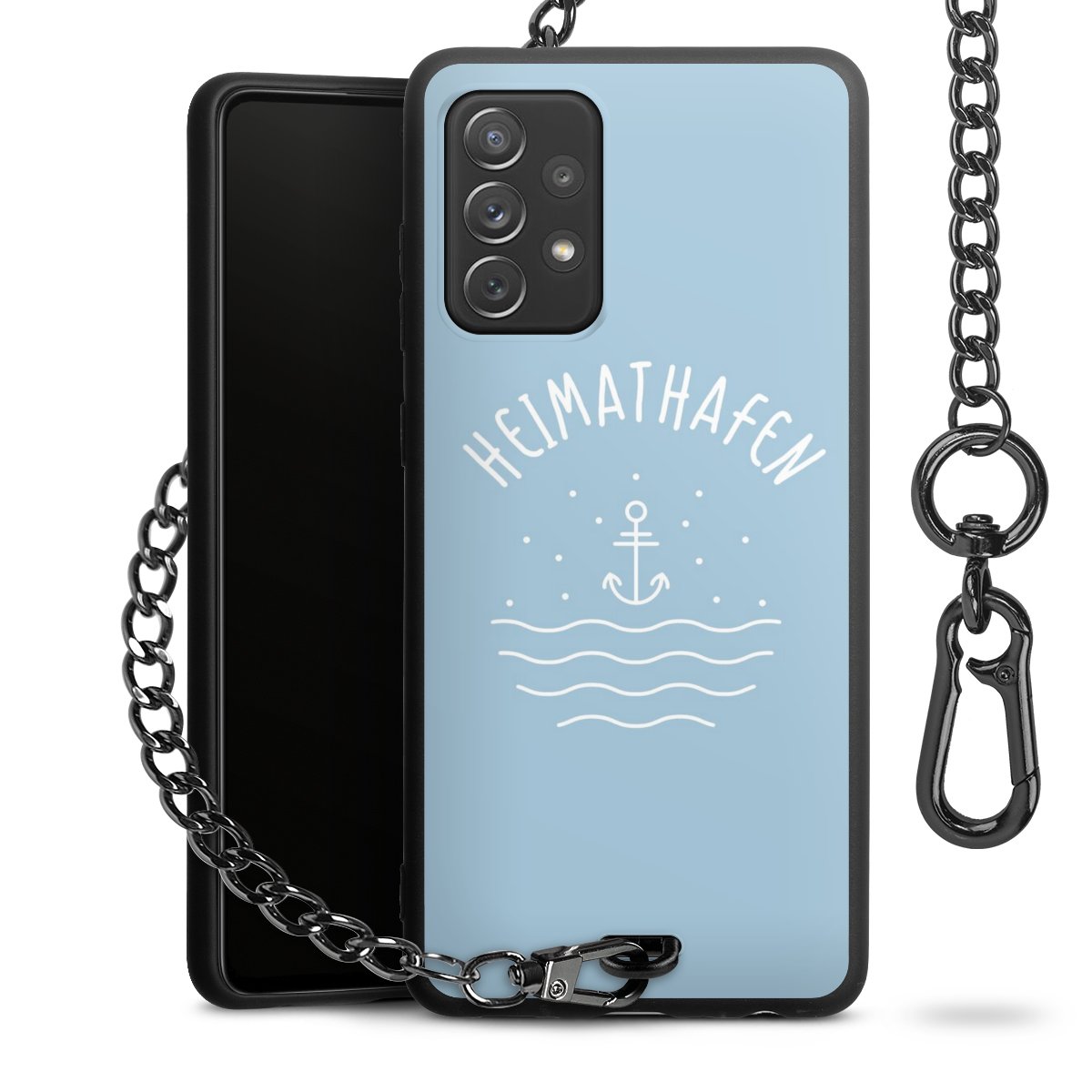 Die mattschwarze Silikon-Handyhülle besteht aus robustem TPU (thermoplastisches Polyurethan). Sie ist flexibel und schützt Dein Smartphone vor Stößen und Kratzern. Die Kette sowie der Karabinerhaken sind aus Metall in Gunmetal-Optik gefertigt. Für dieses Produkt kommen ausschließlich TÜV-geprüfte Materialien zum Einsatz.