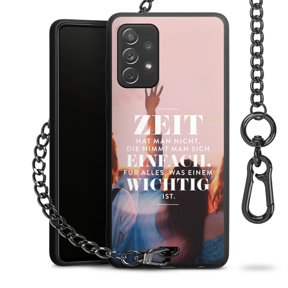 Die Handyhülle verfügt über eine mittig am unteren Rand platzierte Öse, an der die Metallkette stabil befestigt ist. Bestelle die Hülle einfach für Dein Smartphone-Modell, dann passt sie wie angegossen und Du brauchst sie bloß einmal anzudrücken. Handy in die Tasche, Karabiner an den Hosenbund – schon kann die Party starten.