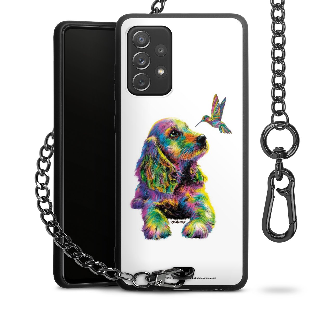 Die Handyhülle verfügt über eine mittig am unteren Rand platzierte Öse, an der die Metallkette stabil befestigt ist. Bestelle die Hülle einfach für Dein Smartphone-Modell, dann passt sie wie angegossen und Du brauchst sie bloß einmal anzudrücken. Handy in die Tasche, Karabiner an den Hosenbund – schon kann die Party starten.