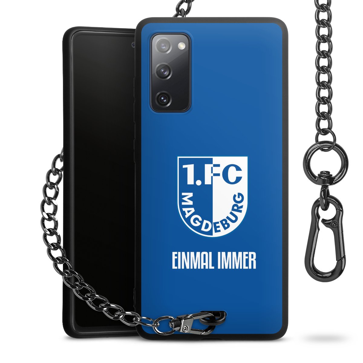 Die Handyhülle verfügt über eine mittig am unteren Rand platzierte Öse, an der die Metallkette stabil befestigt ist. Bestelle die Hülle einfach für Dein Smartphone-Modell, dann passt sie wie angegossen und Du brauchst sie bloß einmal anzudrücken. Handy in die Tasche, Karabiner an den Hosenbund – schon kann die Party starten.