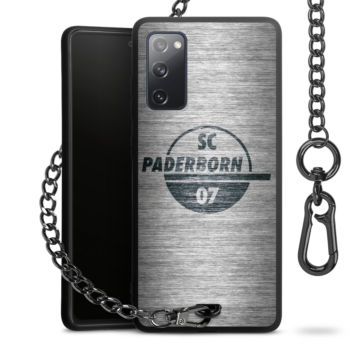 Die Handyhülle verfügt über eine mittig am unteren Rand platzierte Öse, an der die Metallkette stabil befestigt ist. Bestelle die Hülle einfach für Dein Smartphone-Modell, dann passt sie wie angegossen und Du brauchst sie bloß einmal anzudrücken. Handy in die Tasche, Karabiner an den Hosenbund – schon kann die Party starten.
