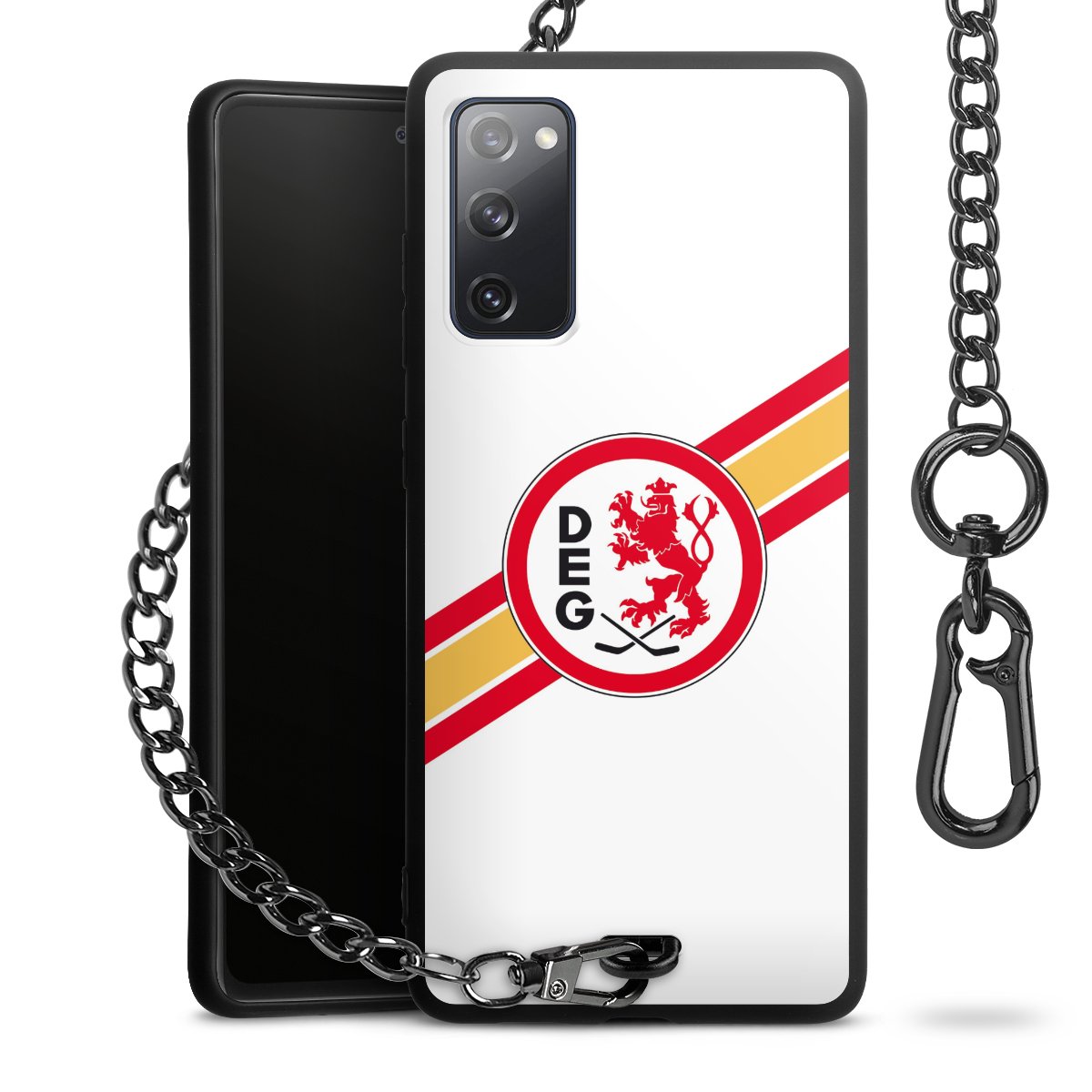 Die Handyhülle verfügt über eine mittig am unteren Rand platzierte Öse, an der die Metallkette stabil befestigt ist. Bestelle die Hülle einfach für Dein Smartphone-Modell, dann passt sie wie angegossen und Du brauchst sie bloß einmal anzudrücken. Handy in die Tasche, Karabiner an den Hosenbund – schon kann die Party starten.