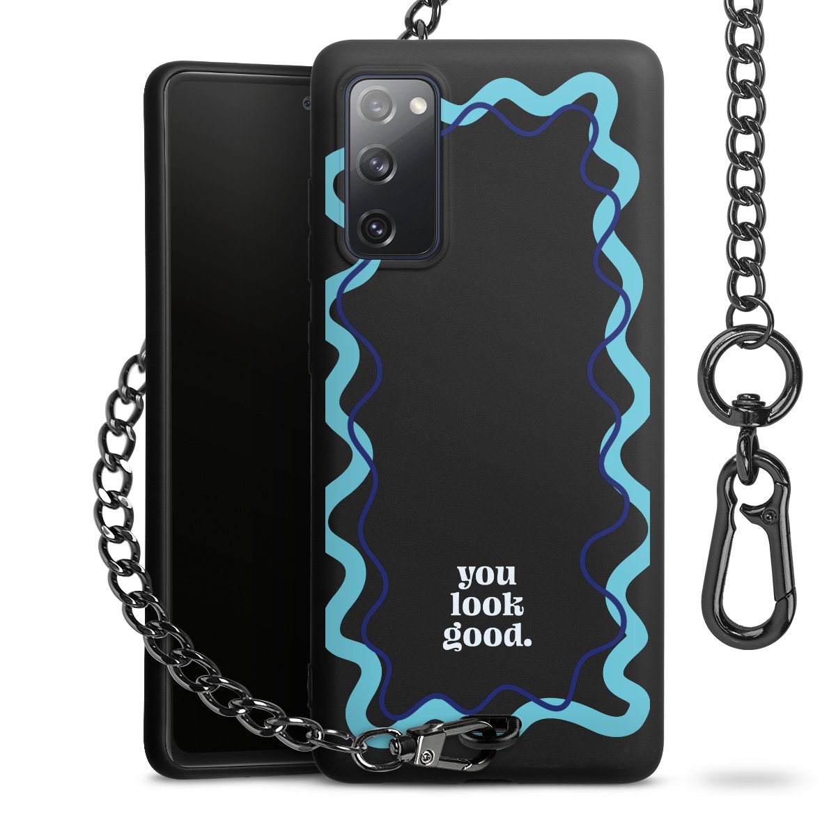 Die Handyhülle verfügt über eine mittig am unteren Rand platzierte Öse, an der die Metallkette stabil befestigt ist. Bestelle die Hülle einfach für Dein Smartphone-Modell, dann passt sie wie angegossen und Du brauchst sie bloß einmal anzudrücken. Handy in die Tasche, Karabiner an den Hosenbund – schon kann die Party starten.