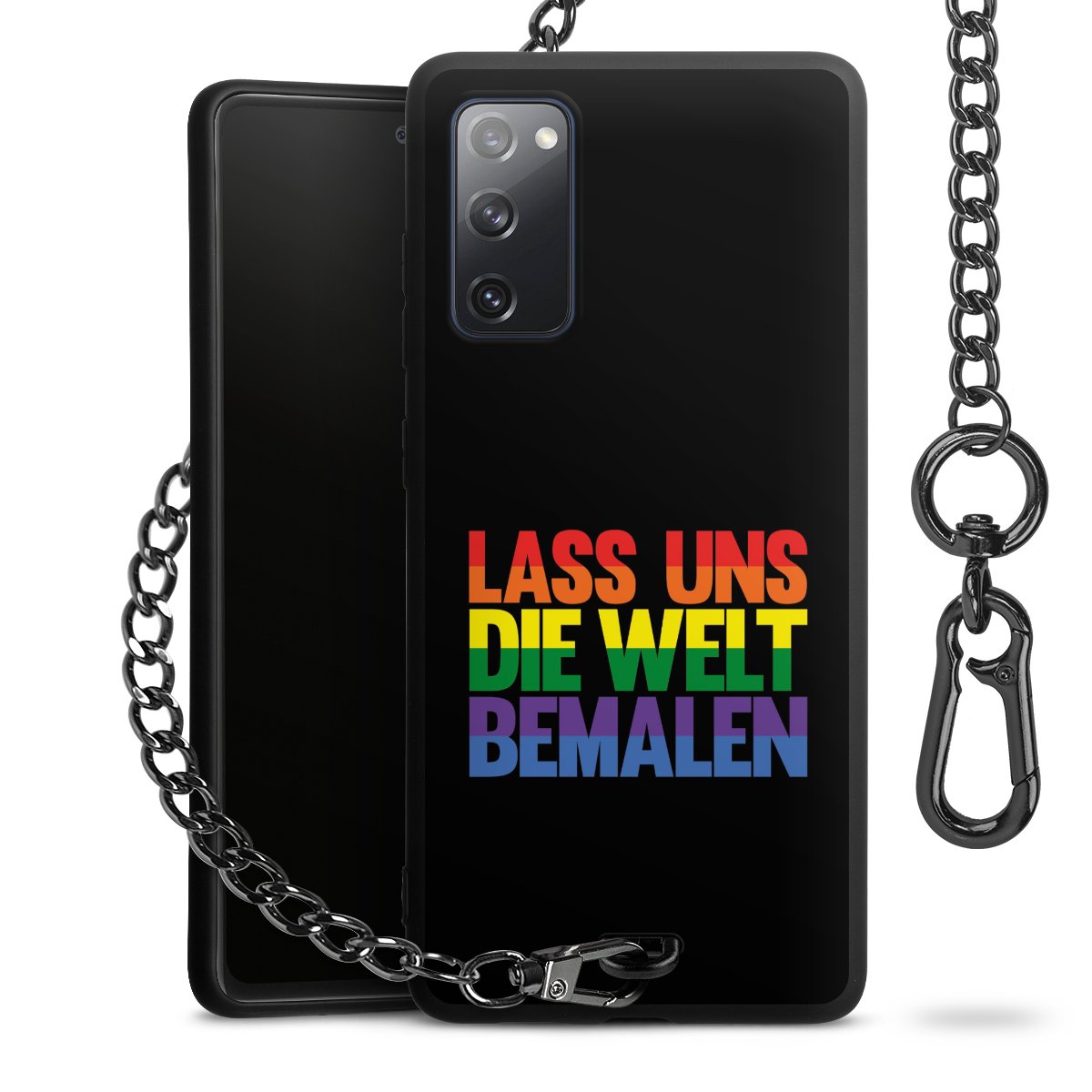 Die Handyhülle verfügt über eine mittig am unteren Rand platzierte Öse, an der die Metallkette stabil befestigt ist. Bestelle die Hülle einfach für Dein Smartphone-Modell, dann passt sie wie angegossen und Du brauchst sie bloß einmal anzudrücken. Handy in die Tasche, Karabiner an den Hosenbund – schon kann die Party starten.