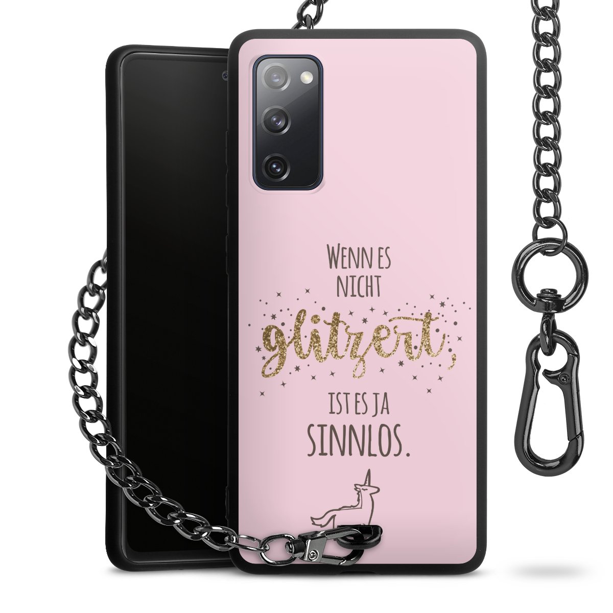 Die Handyhülle verfügt über eine mittig am unteren Rand platzierte Öse, an der die Metallkette stabil befestigt ist. Bestelle die Hülle einfach für Dein Smartphone-Modell, dann passt sie wie angegossen und Du brauchst sie bloß einmal anzudrücken. Handy in die Tasche, Karabiner an den Hosenbund – schon kann die Party starten.