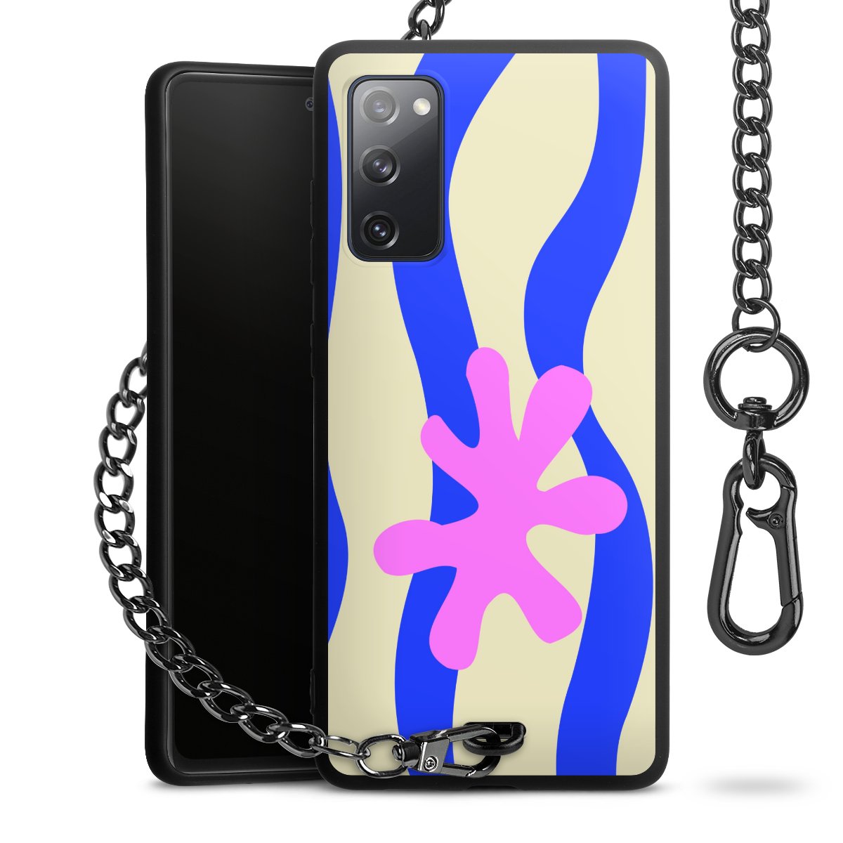 Die Handyhülle verfügt über eine mittig am unteren Rand platzierte Öse, an der die Metallkette stabil befestigt ist. Bestelle die Hülle einfach für Dein Smartphone-Modell, dann passt sie wie angegossen und Du brauchst sie bloß einmal anzudrücken. Handy in die Tasche, Karabiner an den Hosenbund – schon kann die Party starten.