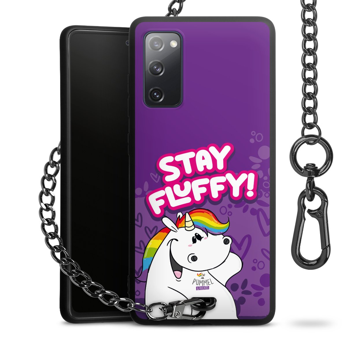 Die Handyhülle verfügt über eine mittig am unteren Rand platzierte Öse, an der die Metallkette stabil befestigt ist. Bestelle die Hülle einfach für Dein Smartphone-Modell, dann passt sie wie angegossen und Du brauchst sie bloß einmal anzudrücken. Handy in die Tasche, Karabiner an den Hosenbund – schon kann die Party starten.