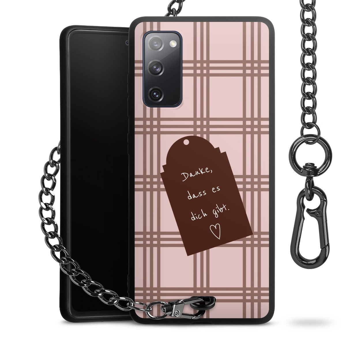 Die Handyhülle verfügt über eine mittig am unteren Rand platzierte Öse, an der die Metallkette stabil befestigt ist. Bestelle die Hülle einfach für Dein Smartphone-Modell, dann passt sie wie angegossen und Du brauchst sie bloß einmal anzudrücken. Handy in die Tasche, Karabiner an den Hosenbund – schon kann die Party starten.