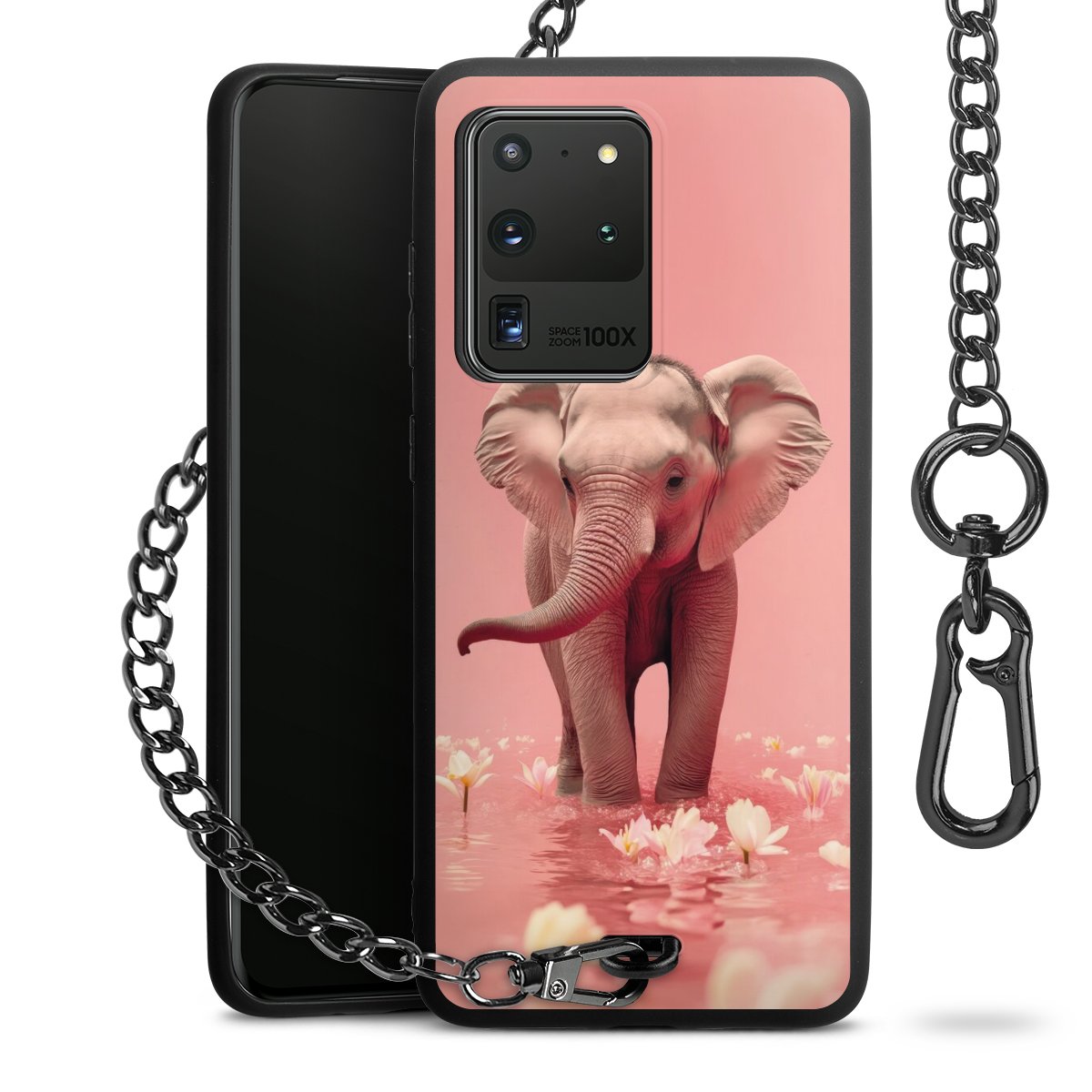 Die Handyhülle verfügt über eine mittig am unteren Rand platzierte Öse, an der die Metallkette stabil befestigt ist. Bestelle die Hülle einfach für Dein Smartphone-Modell, dann passt sie wie angegossen und Du brauchst sie bloß einmal anzudrücken. Handy in die Tasche, Karabiner an den Hosenbund – schon kann die Party starten.