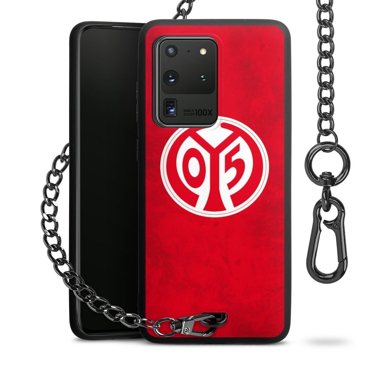 Die Handyhülle verfügt über eine mittig am unteren Rand platzierte Öse, an der die Metallkette stabil befestigt ist. Bestelle die Hülle einfach für Dein Smartphone-Modell, dann passt sie wie angegossen und Du brauchst sie bloß einmal anzudrücken. Handy in die Tasche, Karabiner an den Hosenbund – schon kann die Party starten.