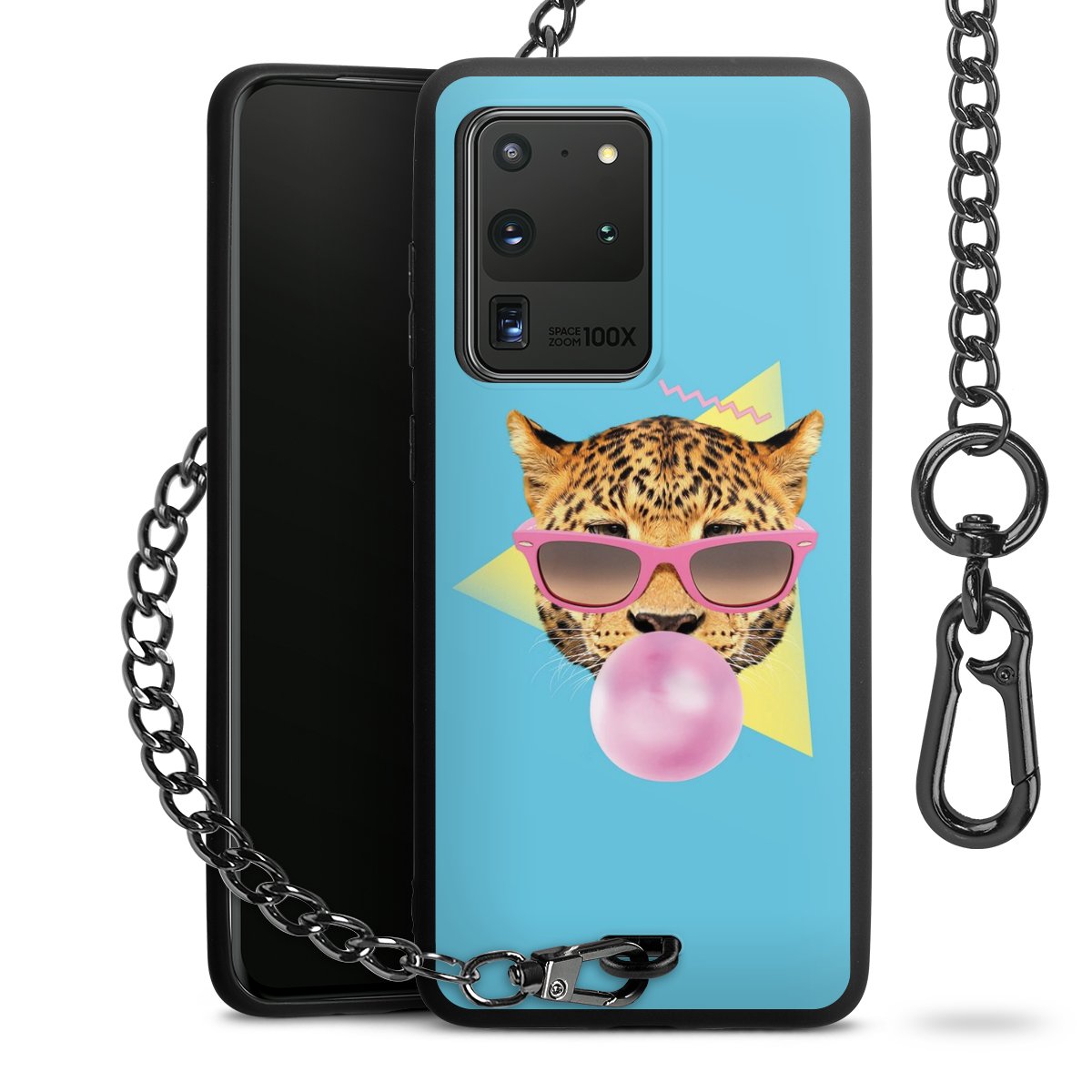 Die Handyhülle verfügt über eine mittig am unteren Rand platzierte Öse, an der die Metallkette stabil befestigt ist. Bestelle die Hülle einfach für Dein Smartphone-Modell, dann passt sie wie angegossen und Du brauchst sie bloß einmal anzudrücken. Handy in die Tasche, Karabiner an den Hosenbund – schon kann die Party starten.