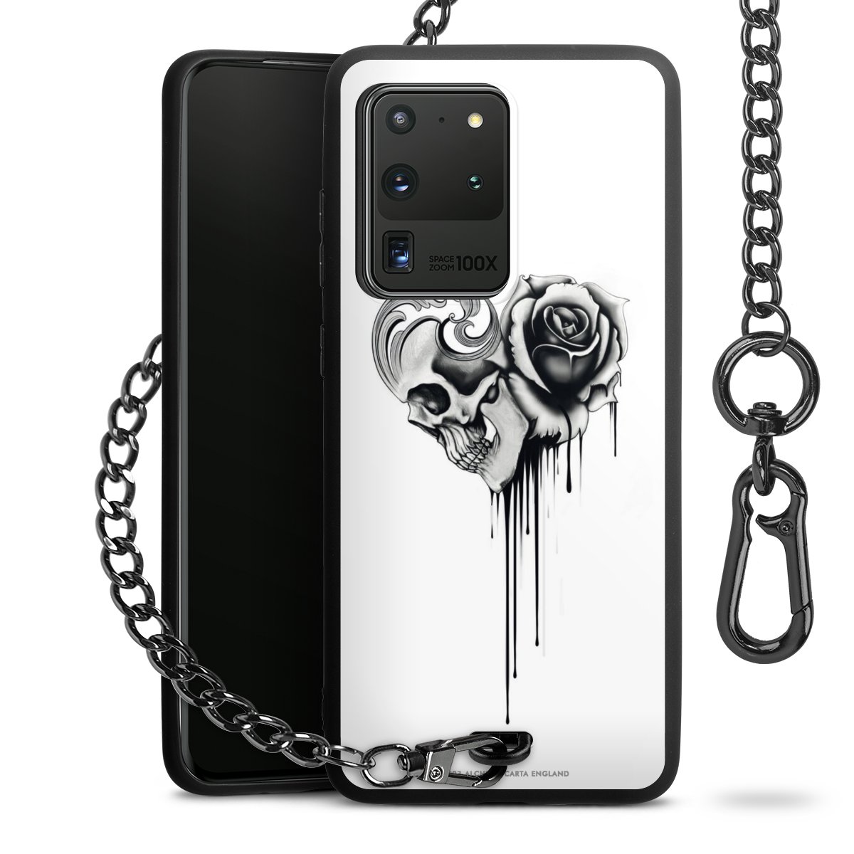 Die mattschwarze Silikon-Handyhülle besteht aus robustem TPU (thermoplastisches Polyurethan). Sie ist flexibel und schützt Dein Smartphone vor Stößen und Kratzern. Die Kette sowie der Karabinerhaken sind aus Metall in Gunmetal-Optik gefertigt. Für dieses Produkt kommen ausschließlich TÜV-geprüfte Materialien zum Einsatz.
