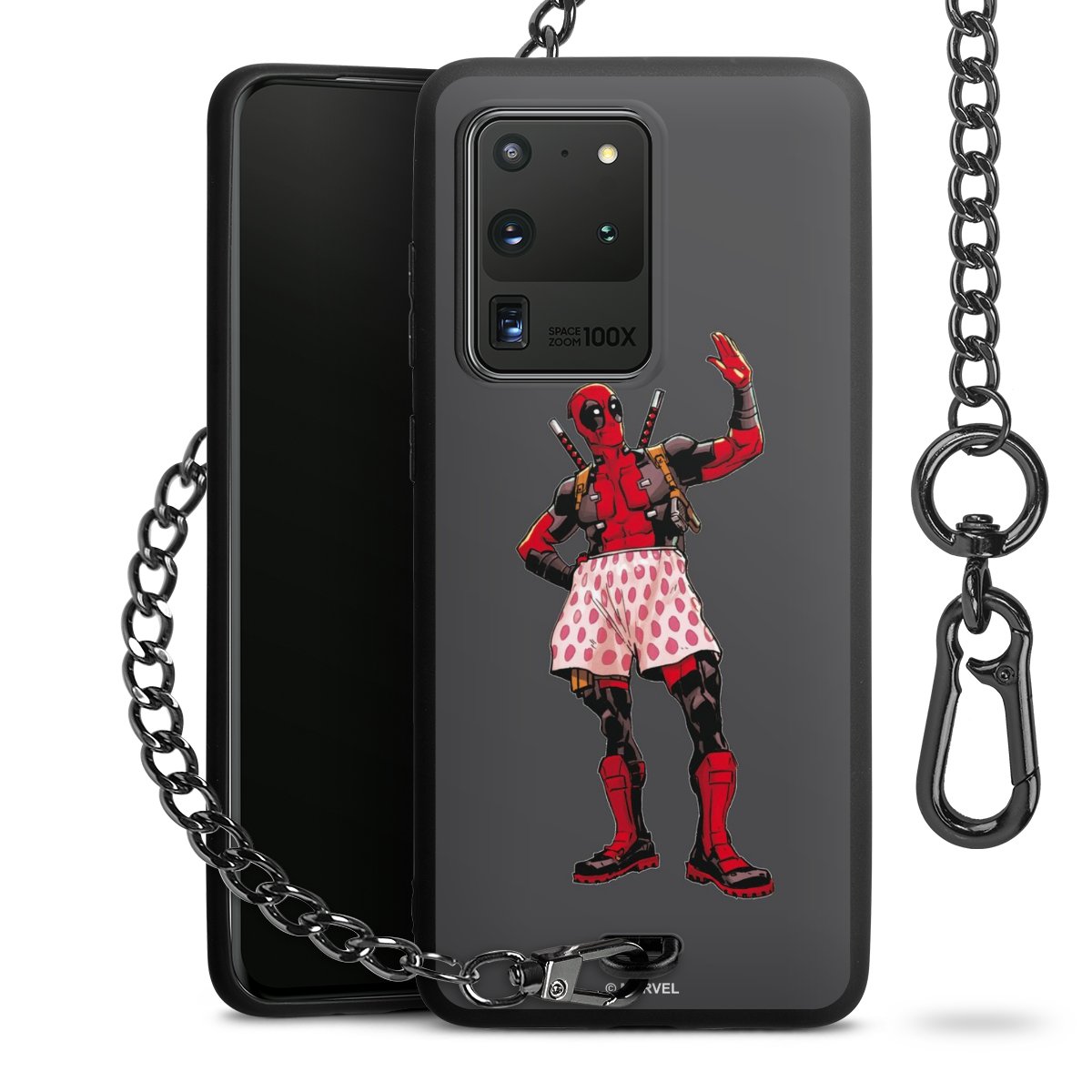 Die mattschwarze Silikon-Handyhülle besteht aus robustem TPU (thermoplastisches Polyurethan). Sie ist flexibel und schützt Dein Smartphone vor Stößen und Kratzern. Die Kette sowie der Karabinerhaken sind aus Metall in Gunmetal-Optik gefertigt. Für dieses Produkt kommen ausschließlich TÜV-geprüfte Materialien zum Einsatz.
