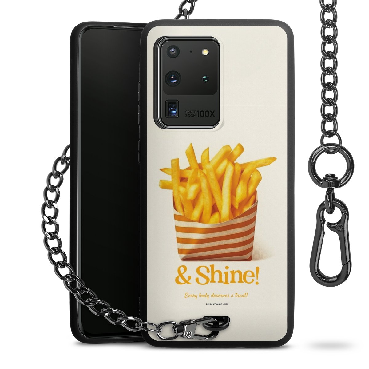 Die Handyhülle verfügt über eine mittig am unteren Rand platzierte Öse, an der die Metallkette stabil befestigt ist. Bestelle die Hülle einfach für Dein Smartphone-Modell, dann passt sie wie angegossen und Du brauchst sie bloß einmal anzudrücken. Handy in die Tasche, Karabiner an den Hosenbund – schon kann die Party starten.