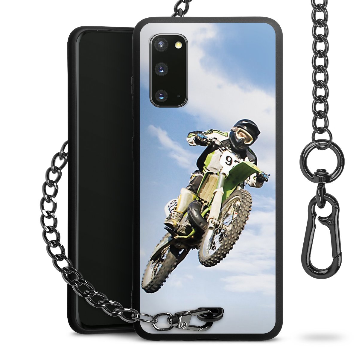 Die Handyhülle verfügt über eine mittig am unteren Rand platzierte Öse, an der die Metallkette stabil befestigt ist. Bestelle die Hülle einfach für Dein Smartphone-Modell, dann passt sie wie angegossen und Du brauchst sie bloß einmal anzudrücken. Handy in die Tasche, Karabiner an den Hosenbund – schon kann die Party starten.