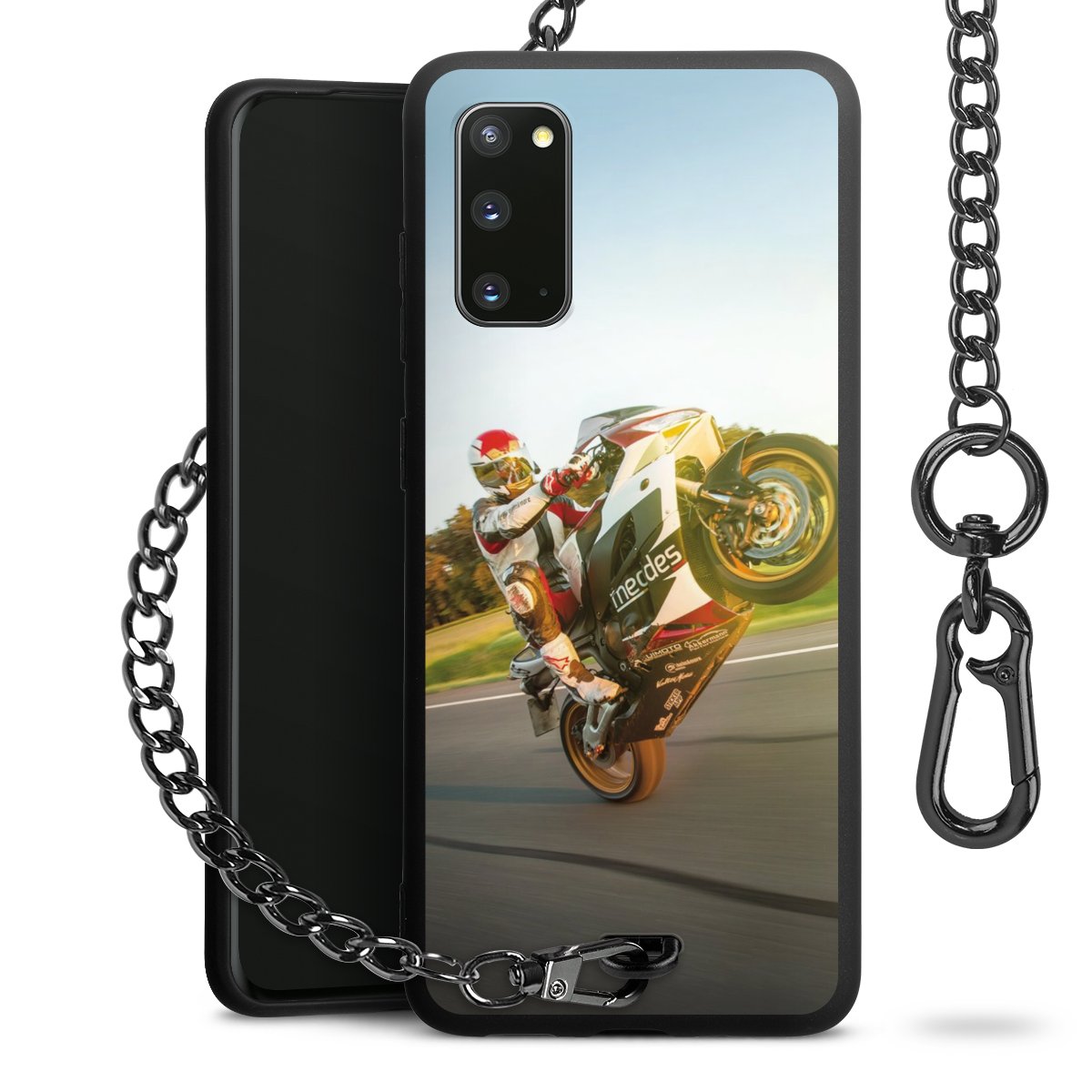 Die Handyhülle verfügt über eine mittig am unteren Rand platzierte Öse, an der die Metallkette stabil befestigt ist. Bestelle die Hülle einfach für Dein Smartphone-Modell, dann passt sie wie angegossen und Du brauchst sie bloß einmal anzudrücken. Handy in die Tasche, Karabiner an den Hosenbund – schon kann die Party starten.