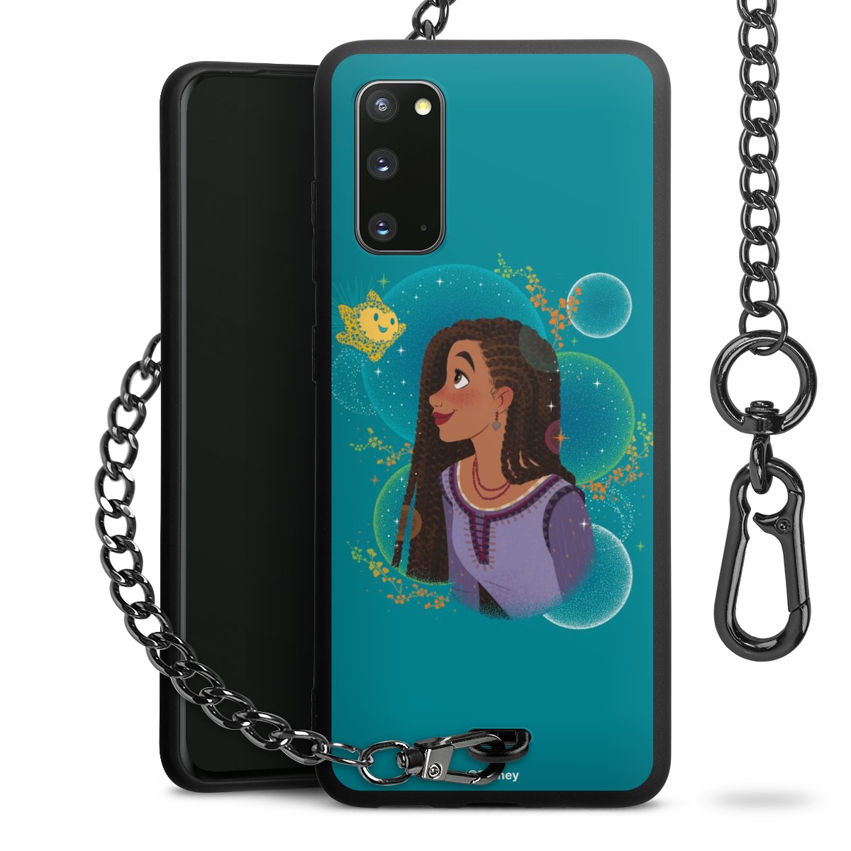 Die Handyhülle verfügt über eine mittig am unteren Rand platzierte Öse, an der die Metallkette stabil befestigt ist. Bestelle die Hülle einfach für Dein Smartphone-Modell, dann passt sie wie angegossen und Du brauchst sie bloß einmal anzudrücken. Handy in die Tasche, Karabiner an den Hosenbund – schon kann die Party starten.