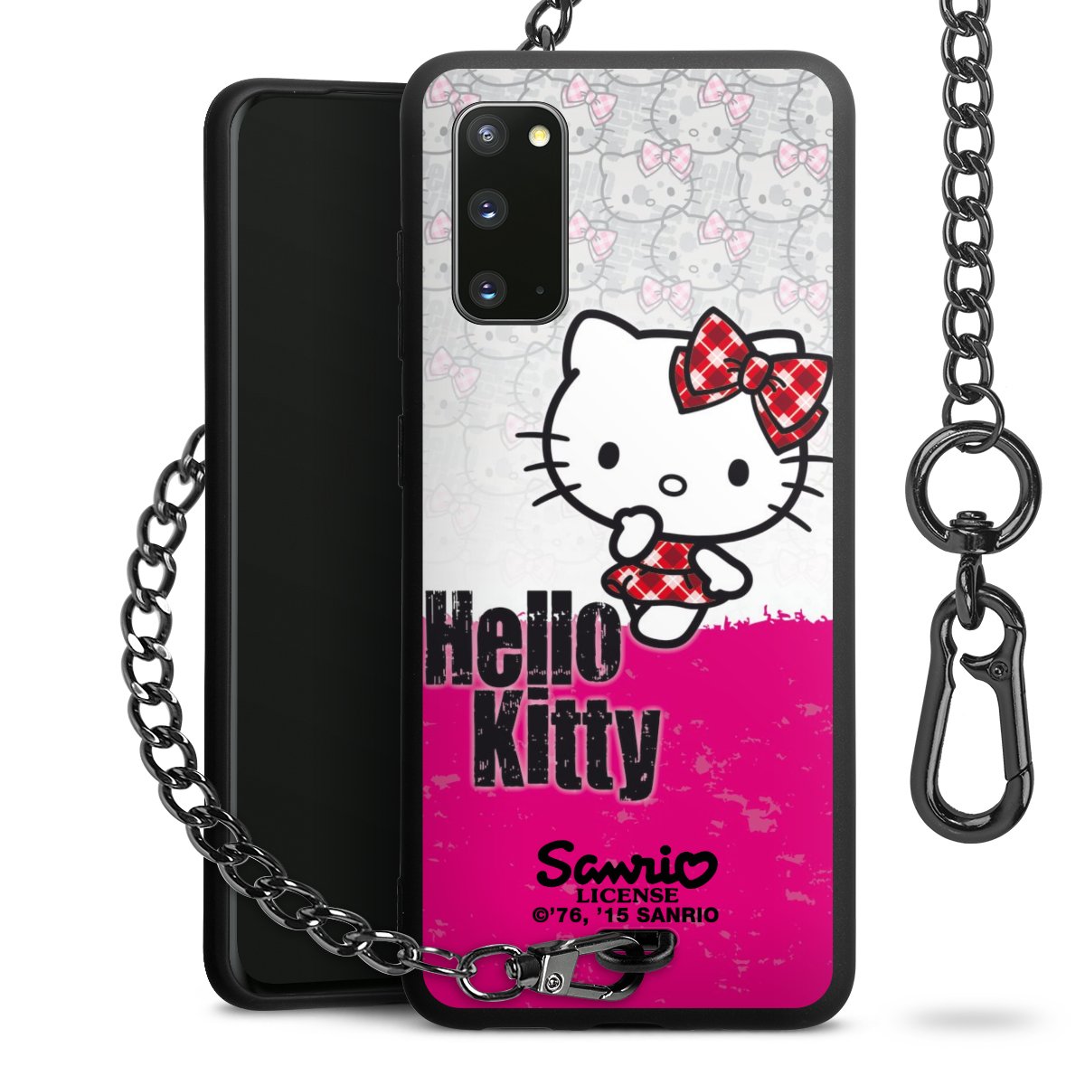Die Handyhülle verfügt über eine mittig am unteren Rand platzierte Öse, an der die Metallkette stabil befestigt ist. Bestelle die Hülle einfach für Dein Smartphone-Modell, dann passt sie wie angegossen und Du brauchst sie bloß einmal anzudrücken. Handy in die Tasche, Karabiner an den Hosenbund – schon kann die Party starten.