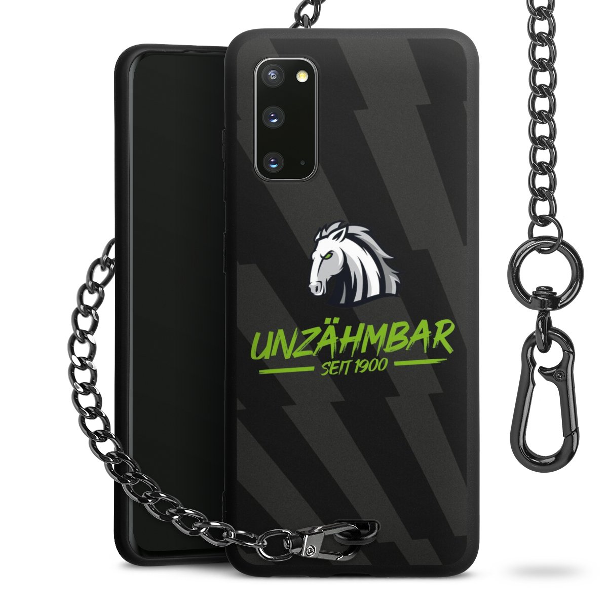 Die mattschwarze Silikon-Handyhülle besteht aus robustem TPU (thermoplastisches Polyurethan). Sie ist flexibel und schützt Dein Smartphone vor Stößen und Kratzern. Die Kette sowie der Karabinerhaken sind aus Metall in Gunmetal-Optik gefertigt. Für dieses Produkt kommen ausschließlich TÜV-geprüfte Materialien zum Einsatz.